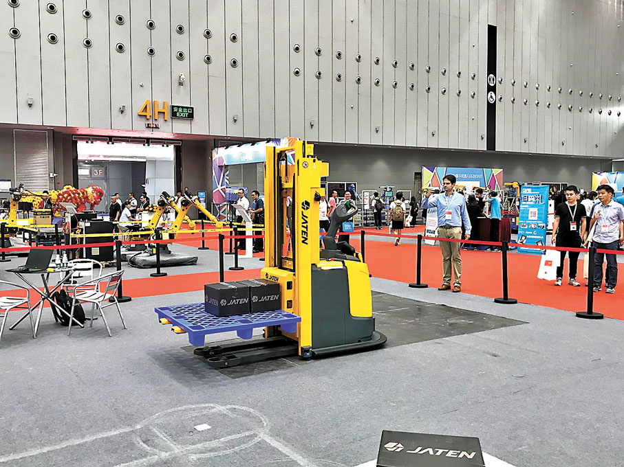 佛山高新區(順德園)的廣東嘉騰機器人自動化有限公司車間內,十餘款無人搬運叉車(Automated Guided Vehicle,簡稱AGV)機械人正在測試軌道上來回穿梭,數十名年輕的工程師在數控平台上輸入指令,調試設備。在5,000平方米的產研車間,「改進一代,研發一代,預研一代」的橫額十分醒目。