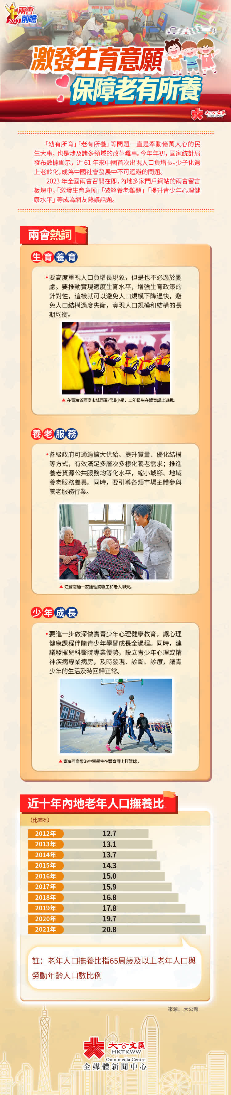 (大公報記者 江鑫嫻)「幼有所育」「老有所養」等問題一直是牽動億萬人心的民生大事,也是涉及諸多領域的改革難事。今年年初,國家統計局發布數據顯示,近61年來中國首次出現人口負增長。少子化遇上老齡化,成為中國社會發展中不可迴避的問題。2023年全國兩會召開在即,內地多家門戶網站的兩會留言板塊中,「激發生育意願」「破解養老難題」「提升青少年心理健康水平」等成為網友熱議話題。有代表建議立法改善新建小區配套,如規劃幼託一體化的幼兒園。