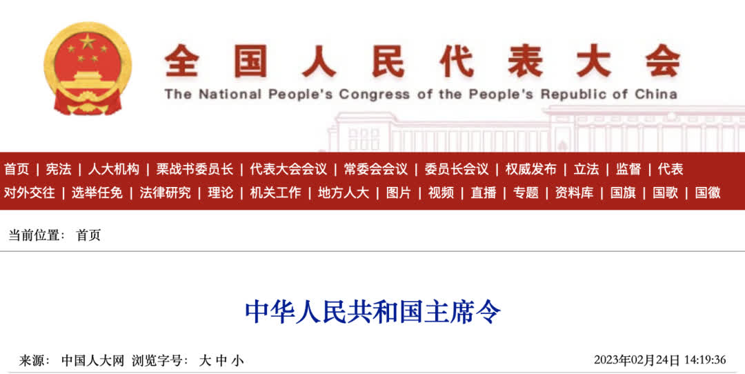 根據中華人民共和國第十三屆全國人民代表大會常務委員會第三十九次會議於2023年2月24日的決定: