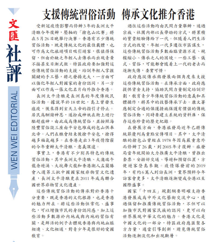 受新冠疫情影響而停辦3年的長洲太平清醮今年復辦,壓軸的「搶包山比賽」將在5月26日晚舉行決賽。香港有不少傳統習俗活動,既是傳統文化的最佳載體,也可作為文化旅遊項目吸引遊客,很值得保留,但由於缺乏年輕人去傳承而出現青黃不接甚至日漸式微。特區政府要加強對這些傳統習俗活動的支援,培訓年輕人掌握關鍵的手工藝,將之發揚光大,一方面可以強化年輕人對國家的身份認同,另一方面可以作為一張文化名片向外推介香港。