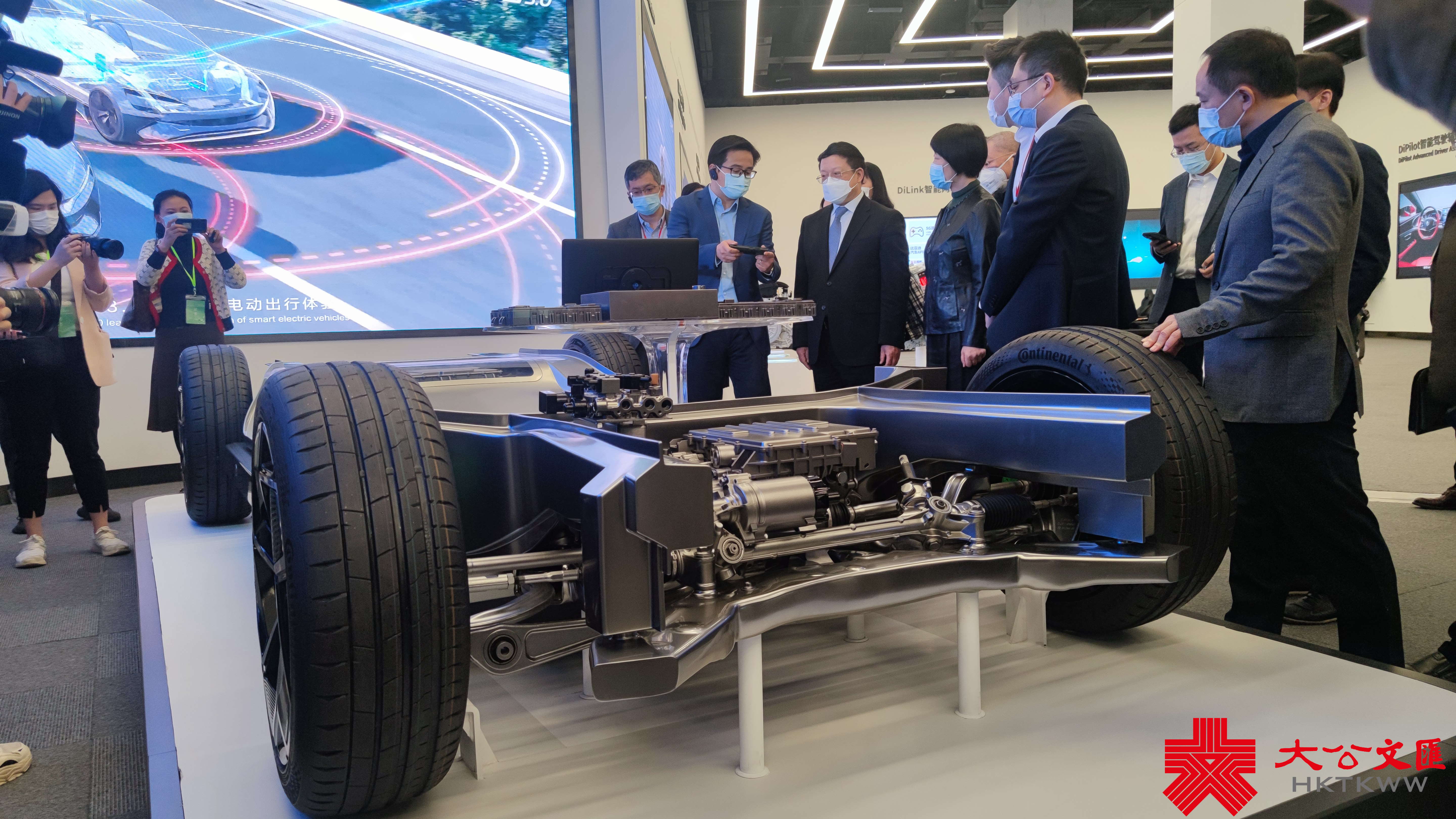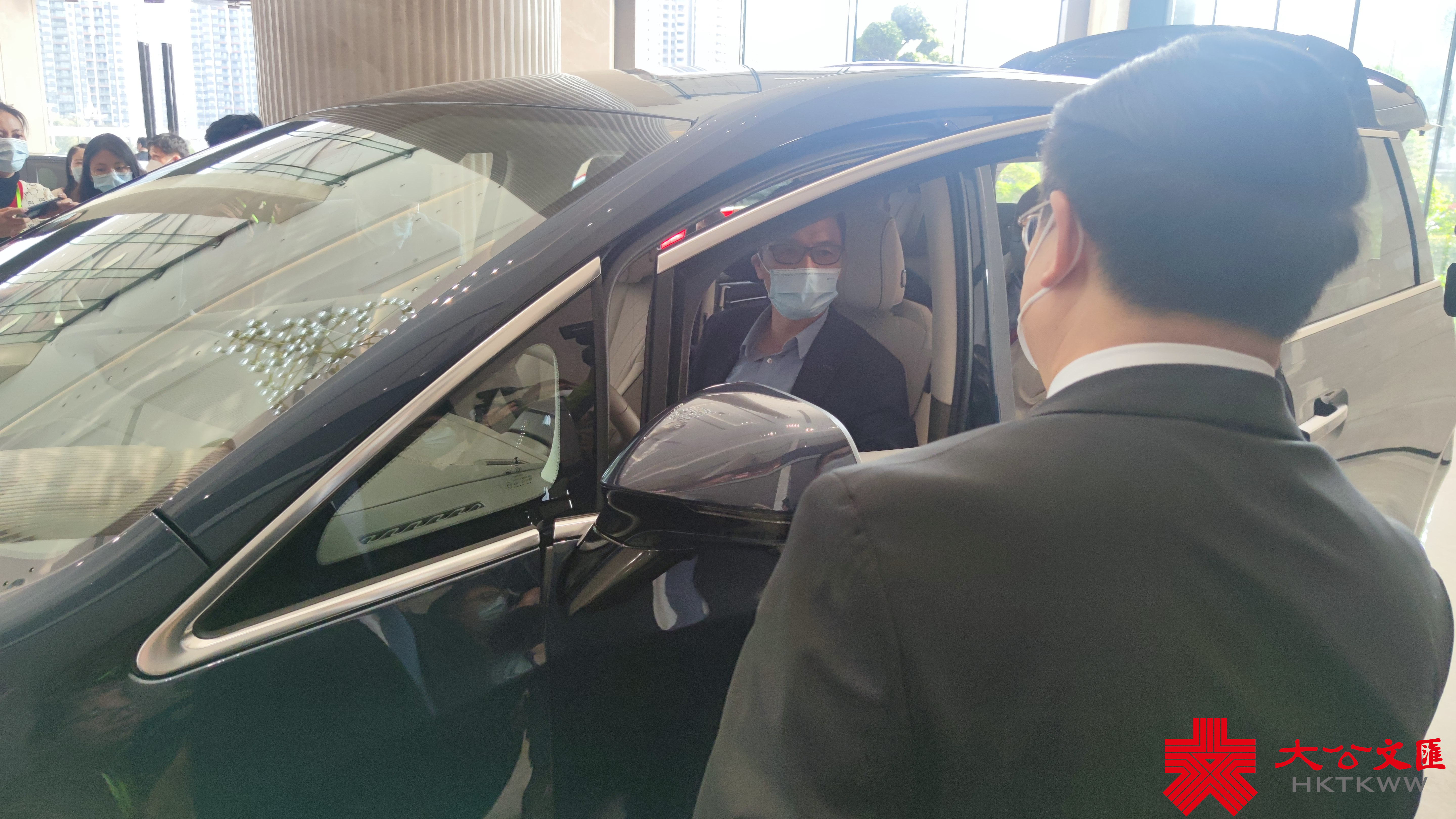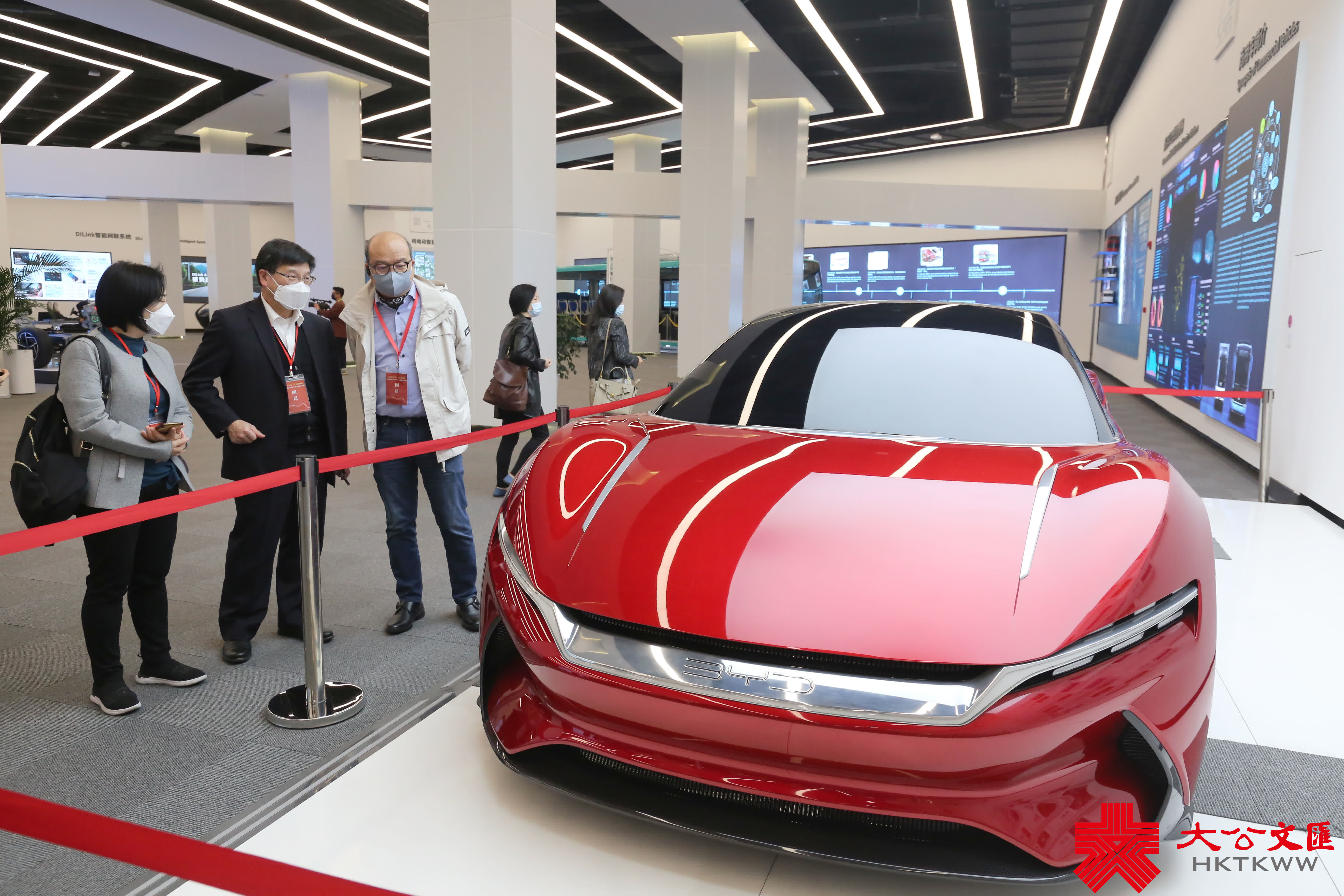 (大公文匯全媒體記者 盧靜怡、李望賢 深圳報道)25日上午,香港傳媒高層人士大灣區參訪團來到深圳比亞迪考察。在展廳內,停放着幾款比亞迪最新型的電動車,參訪團成員饒有興致地向工作人員詳細諮詢汽車性能,還有不少參訪團成員直接坐上駕駛座,手握方向盤,親身體驗新車的舒適度。一輛紅色流線型車身的紅色概念超級跑車成為現場目光焦點,引來參訪團成員不斷拍照。