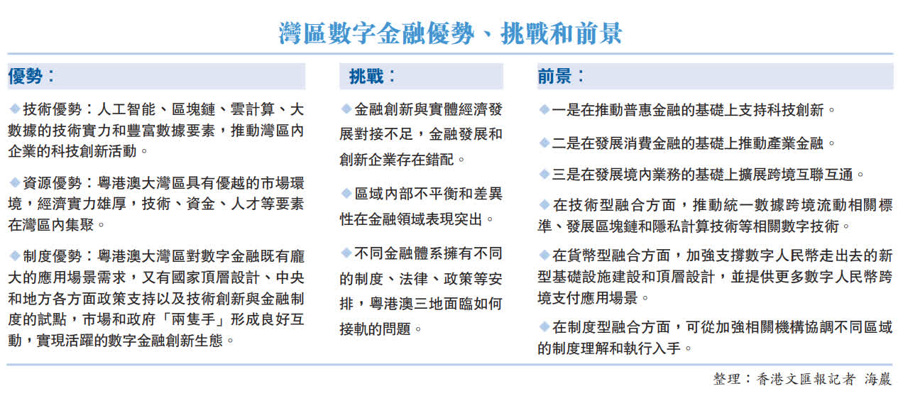 (香港文匯報記者 海巖 北京報道)內地金融智庫中國金融四十人研究院25日發表《粵港澳大灣區數字金融的發展機遇、挑戰與前景》報告提出,展望未來,數字金融在助力大灣區進一步融合發展方面具有良好的前景。報告建議,在大灣區加強支撐數字人民幣走出去的新型基礎設施建設和頂層設計,提供更多數字人民幣跨境支付應用場景,將香港定位為中國最重要的國際金融中心,建設成全世界最重要的人民幣金融中心。