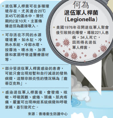 據悉,退伍軍人桿菌會引起退伍軍人病,主要徵狀為發燒、咳嗽,及胃腸道徵狀,但免疫力較低患者可能會出現肺炎、神經損傷,甚至死亡。該病菌尤其在20至45℃的水中尤為活躍,容易積聚在水池和浴缸等地方。曾有日本溫泉旅館的顧客死於退伍軍人桿菌感染。
