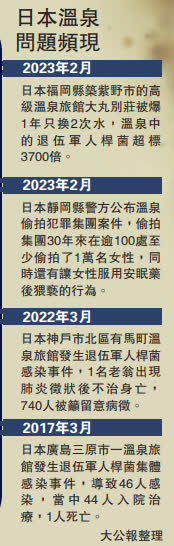 位於福岡縣築紫野市的老字號高級旅館「大丸別莊」創立於1865年,連昭和天皇也曾下榻,是日本公認的高級溫泉旅館。《朝日新聞》報道,大丸別莊每年僅在休息日換2次水,注入氯氣消毒的工作也經常被忽視,濃度不達標。