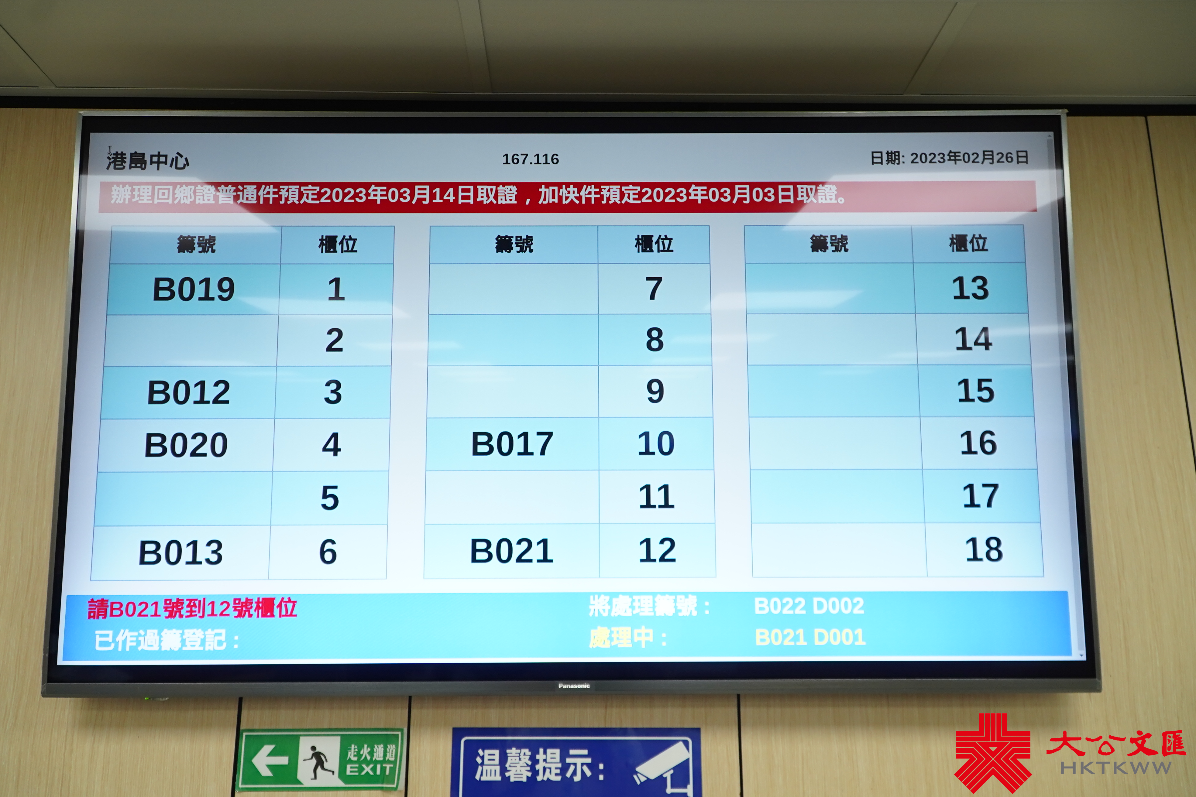 記者早上9時到達香港中旅證件服務港島中心,現場已經大排人龍,有工作人員在現場維持秩序及解答市民問題。現場的電視屏幕上顯示,今日辦理普通證件可於3月14日領取證件,加快件則可以在3月3日領取。
