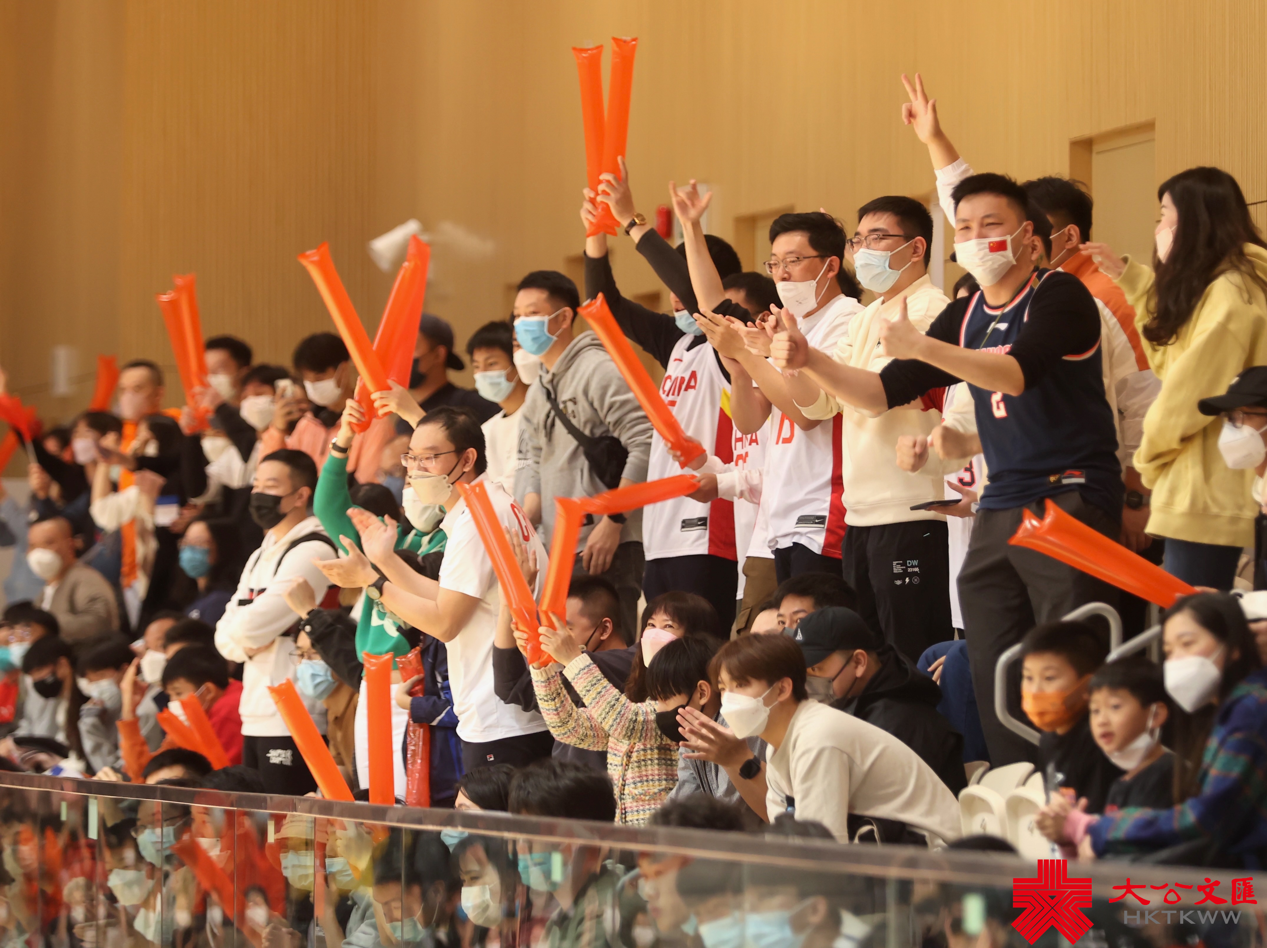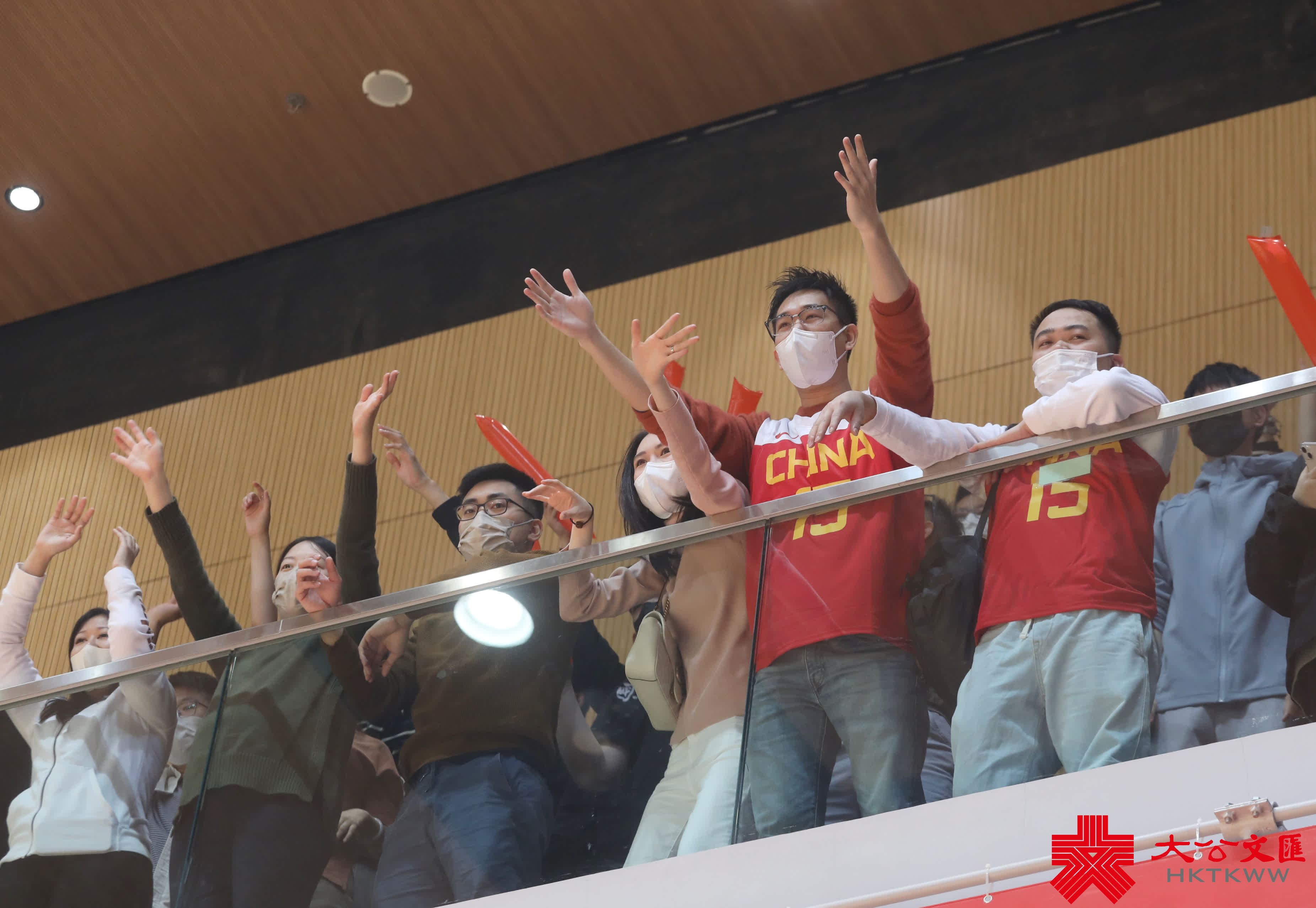 球場上是運動員們奮力拚搏的身影,耳邊是球迷們熱切的吶喊「中國隊,加油!」大家做足了準備來為國家隊加油,有球迷穿着印有「CHINA」字樣的籃球服;也有人將愛心形狀的國旗貼紙貼在口罩上;有香港球迷特地帶着籃球來觀賽,希望能獲得國家隊隊員的簽名。
