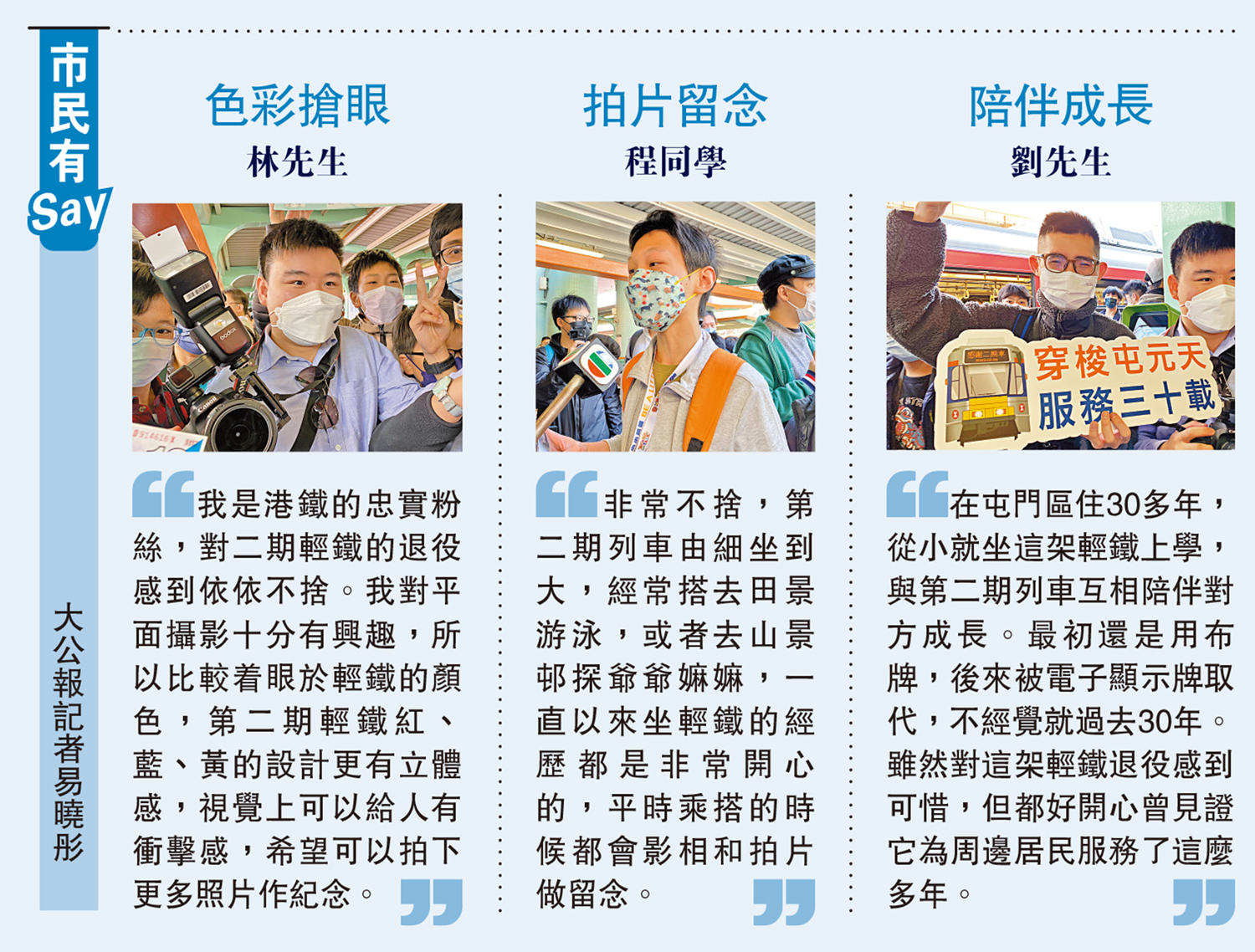 居住於屯門的鐵路迷何同學一早便到兆康站等候,他特意帶上父親收藏的早期二期輕鐵車票,握在手中猶如珍寶,向陪伴自己成長的二期輕鐵告別。他形容二期輕鐵的色彩「好有港鐵風格」,亦最喜歡其車頭的設計,「一定要多影些照片,將它永遠記在腦海裏。」街坊劉先生說,以前每日都搭二期輕鐵上學,惟工作後乘搭的機會減少,於是趁放假專門來坐最後一班二期列車。他亦認為港鐵將二期輕鐵捐贈予學校「非常有價值」,希望學生能對輕鐵歷史有更深的認識。
