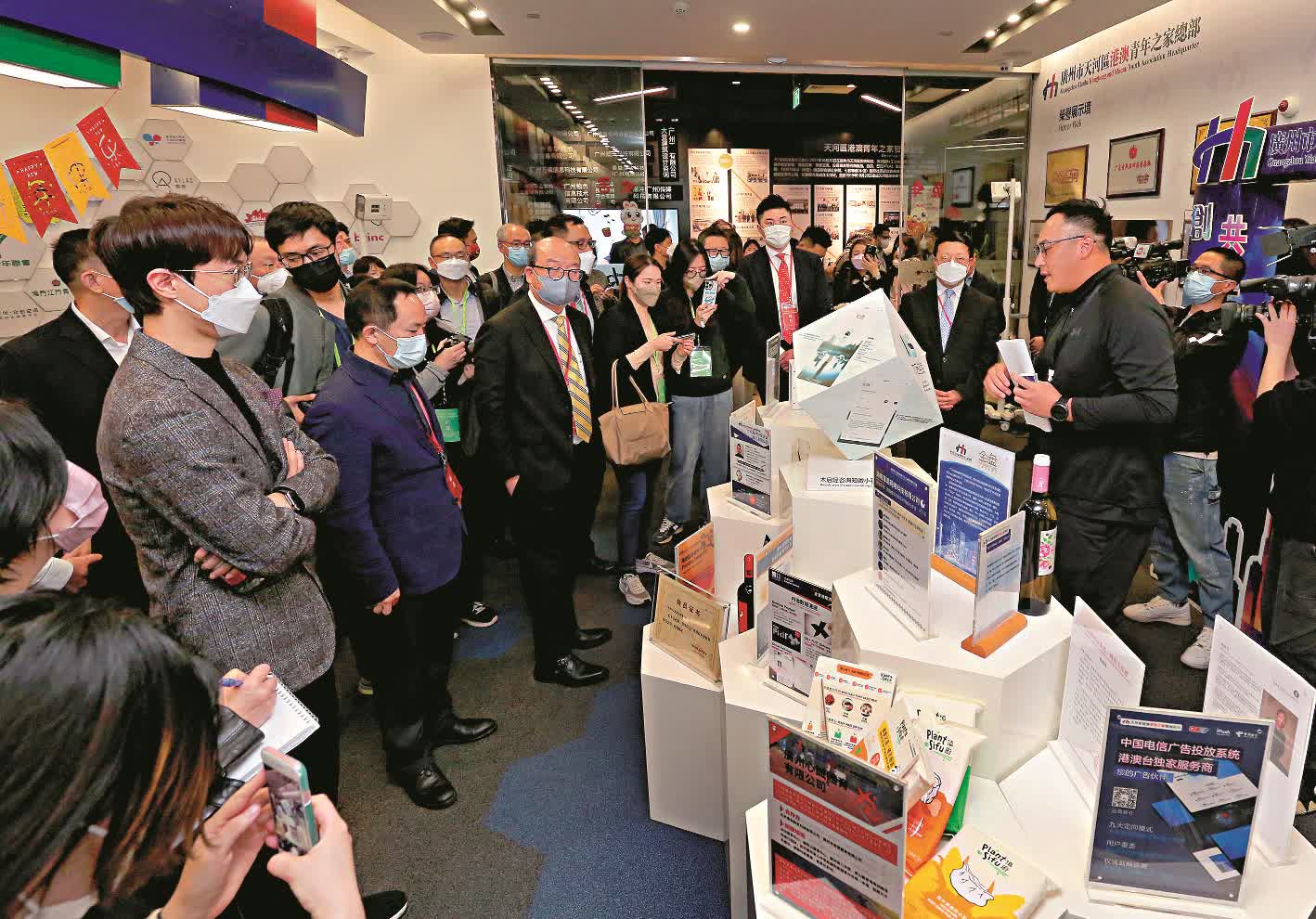 考察中,參訪團成員深入了解了不少港青創業的「明星」項目,紛紛為這些勇於求新求變的香港年輕人點讚鼓勁。創業港青介紹情況時,隨團記者蜂擁而至,現場呈現出十足的「高人氣」。