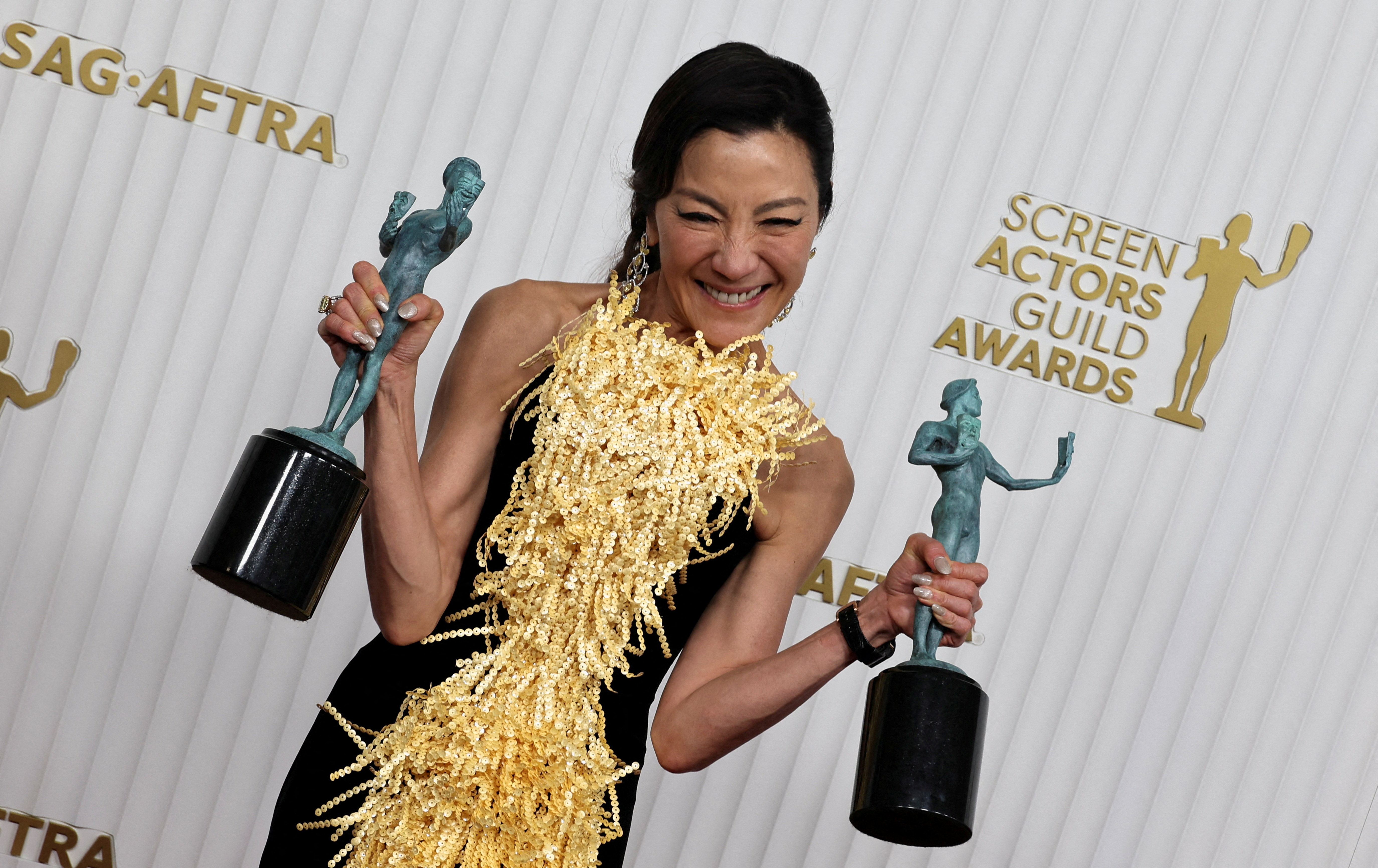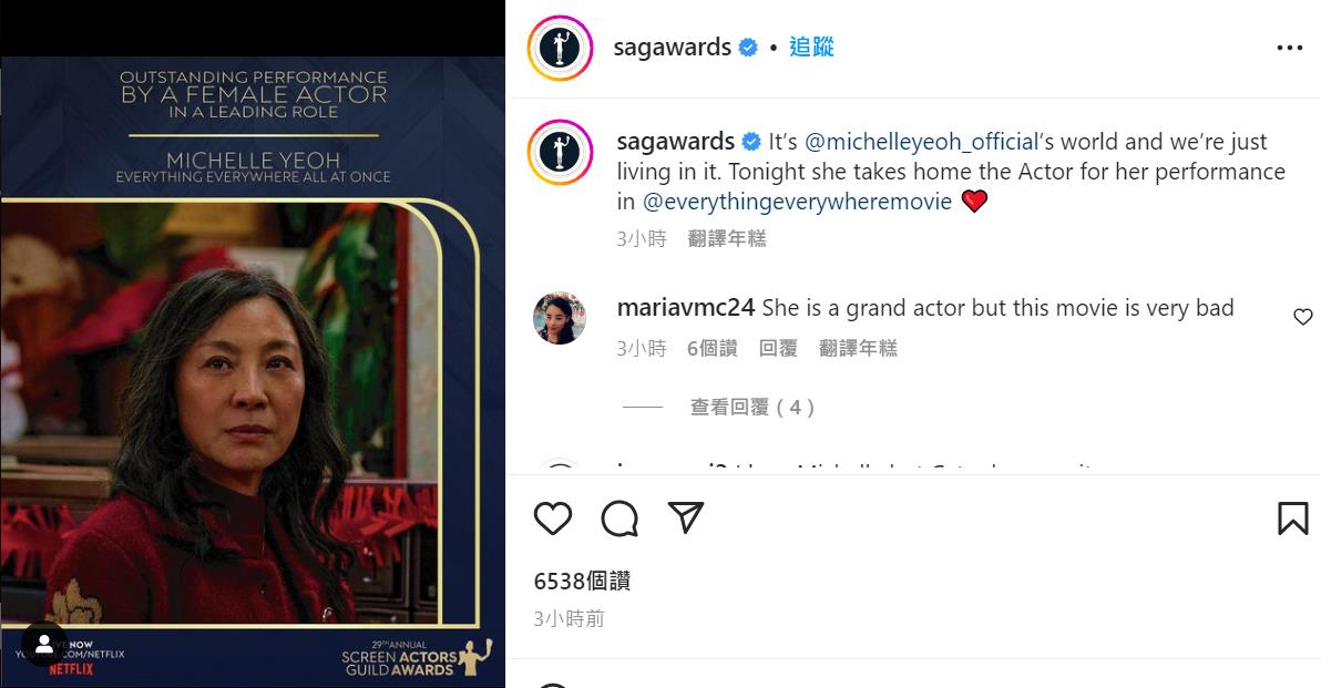 (大公文匯全媒體特約記者 陳惠芳)美國演員工會獎電影類得獎名單被視為奧斯卡金像獎頒獎典禮重要風向標。2023美國演員工會獎(SAG Awards)於香港時間今日(27日)舉行頒獎典禮,華裔演員楊紫瓊憑電影《奇異女俠玩救宇宙》(又譯《瞬息全宇宙》《媽的多重宇宙》)奪得電影類最佳女主角,成為首位亞裔女演員贏得此項殊榮。楊紫瓊這次擊敗勁敵姬蒂白蘭芝(Cate Blanchett),為下月中奧斯卡影后大戰再添變數。