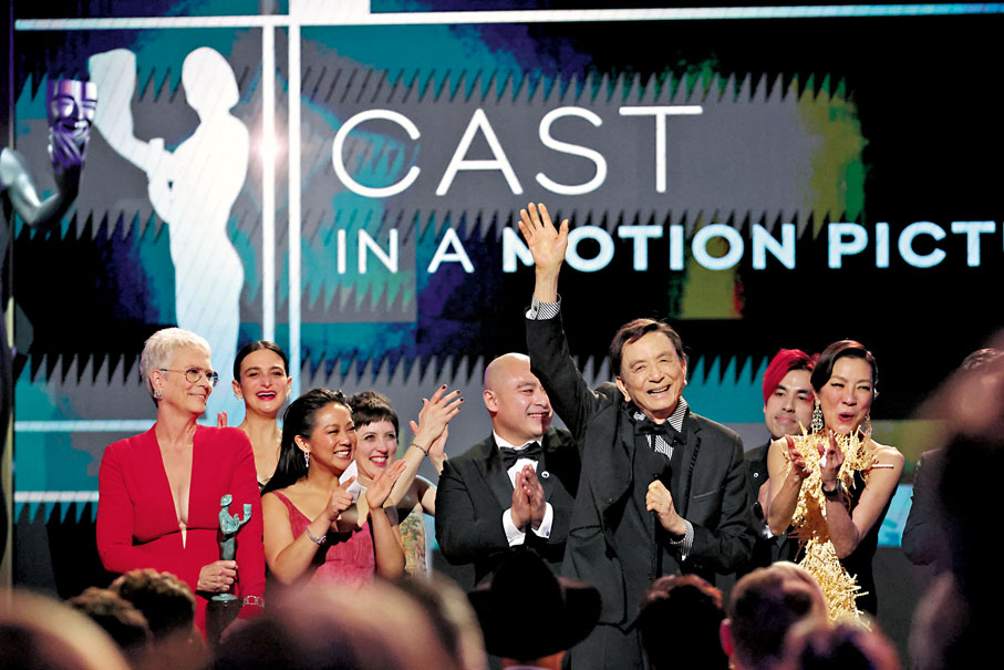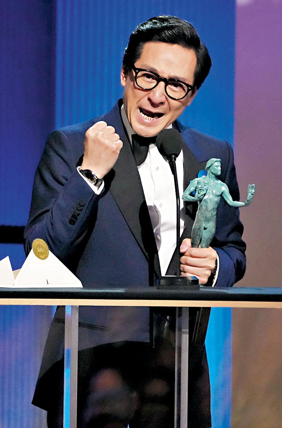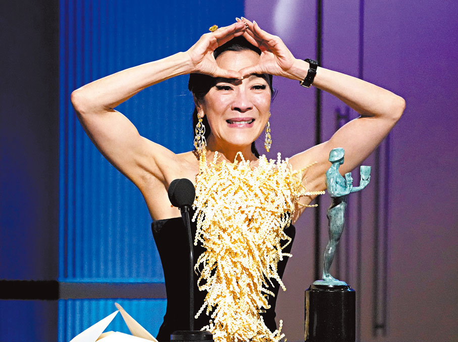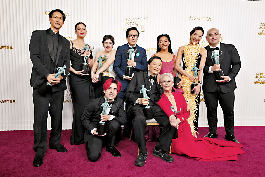 香港文匯報綜合外電報道,第29屆美國演員公會(SAG)頒獎禮於香港時間昨早舉行,怪誕科幻喜劇片《奇異女俠玩救宇宙》賽前獲5項提名,最終捧走電影類「最佳整體演出」、「最佳女主角」和「最佳男、女配角」4大獎,亞裔演員在今屆的SAG中大放異彩,楊紫瓊擊敗《Tar》姬蒂白蘭芝(Cate Blanchett)等勁敵,成為SAG舉辦近30年來首名亞裔影后!另一亞裔男星關繼威亦拿下最佳男配角獎!