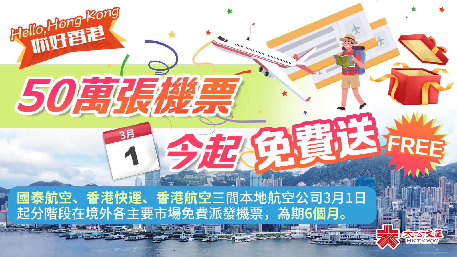 大公文匯全媒體報道,為一連串向全世界說好香港故事,推廣香港商機、文化景點及旅客體驗的活動揭開序幕,政府推出「你好,香港」宣傳活動,本港將免費派發50萬張機票提供給來自各地的旅客,或是世界上最大的歡迎旅客舉措。機管局表示,50萬張機票由本港3間航空公司向境外市場贈送,機票將由今日(3月1日)開始派發,為期6個月。