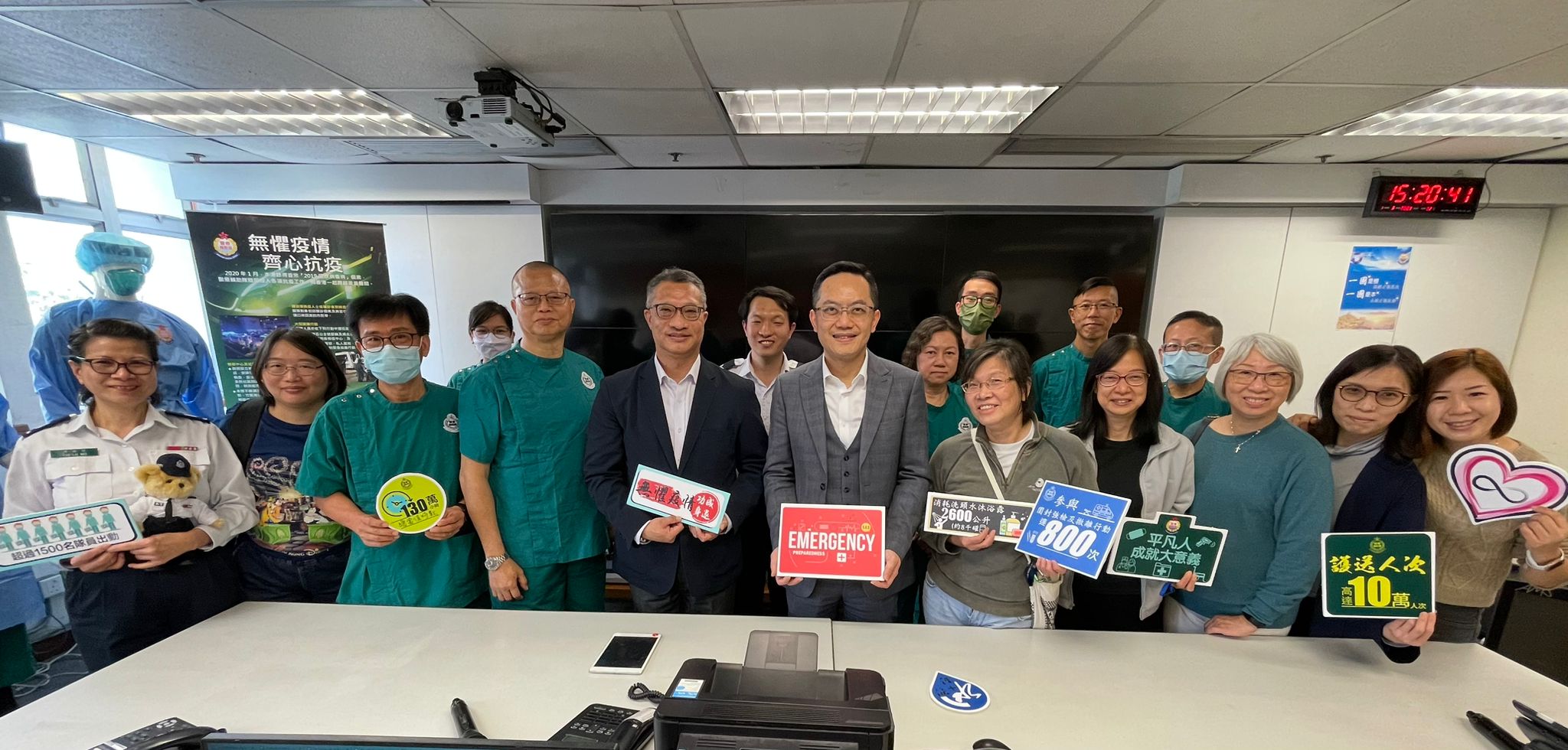大公文匯全媒體報道,醫療輔助隊今日(3月1日)表示,因應疫情而啟動的總部控制室今日正式停止運作。隨着醫療輔助隊總監林文健和總參事黃英強把總部控制室的電視屏幕關上,標誌着疫情工作正式完結。