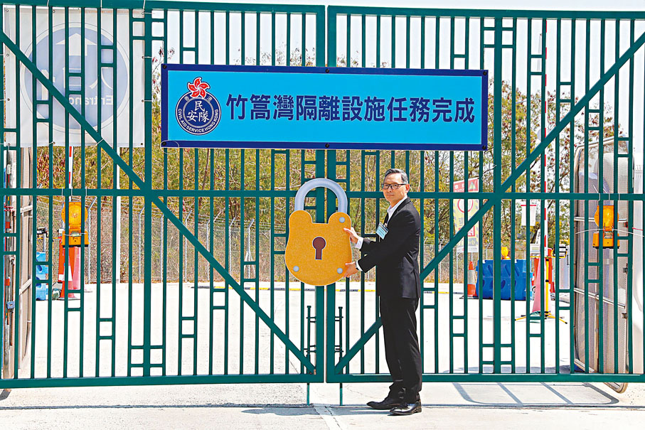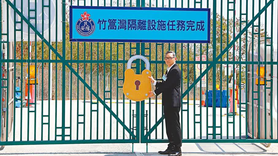 (香港文匯報 記者 唐文)自2020年7月啟用的竹篙灣社區隔離設施昨日關閉,設施大門外掛上「竹篙灣隔離設施任務完成」紙牌及大型模擬門鎖。這座抗疫標誌性建築的關閉,象徵香港已全面復常。不少職員在臨別前與設施合影,與並肩作戰的夥伴們道別,也回憶抗疫期間發生的一幕幕插曲,有艱苦也有暖心。保安局副局長卓孝業表示,竹篙灣共服務逾27萬名人士,在市民心中的形象也慢慢提升,從「糟糕灣」(竹篙灣諧音)升格為「竹大」(竹篙灣大學)美譽,他認為竹篙灣匯聚多個政府部門及不同社會力量,相信港人萬眾一心,無事不可行。