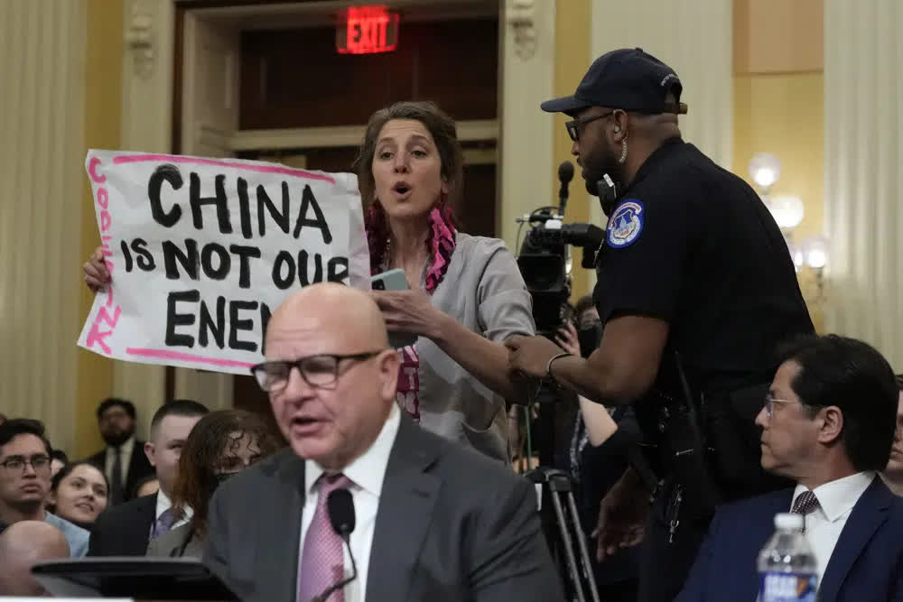 前國家安全顧問麥克馬斯特發表講話時,一名女子舉着「中國不是我們的敵人」的紙牌站了起來,其後她在國會警衞的護送下離開現場。