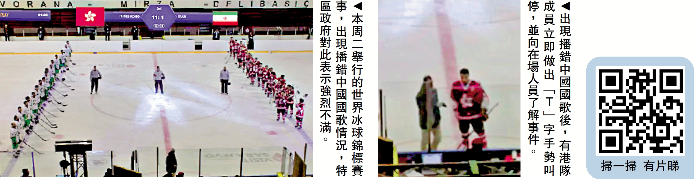 (大公報 記者 鄭文迪)再有國際體育賽事發生播錯國歌事件。本周二(2月28日)在波斯尼亞舉行的世界冰球錦標賽香港對伊朗賽事,中國國歌被播成跟「港獨」有關連的歌曲,港隊成員立即做出「T」字手勢叫停。特區政府對世界冰球錦標賽上播放國歌出錯表示強烈不滿,要求港協暨奧委會嚴肅跟進事件。港協暨奧委會表示,香港冰球協會早前已向主辦機構提供正確版本的國歌,已責成協會提交報告。