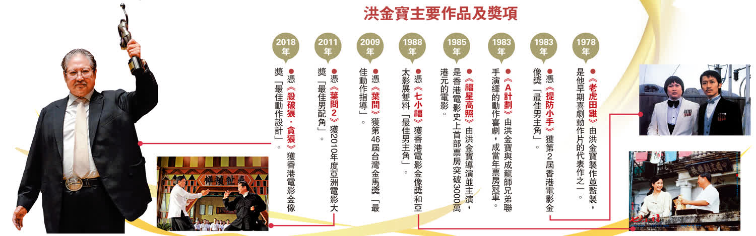 從擔任演員到動作指導,由導演以至出品人,洪金寶的名字成為了品質和票房的保證。他參演的電影多不勝數,為觀眾帶來無數經典場面與角色,且題材種類多元,亦多次獲得香港電影金像獎「最佳男主角」「最佳動作設計」等榮譽。1983年,洪金寶憑主演的《提防小手》,獲第2屆香港電影金像獎最佳男主角獎。同年,由他設計動作場面、自導自演的影片《敗家仔》,獲得金像獎最佳動作設計獎。