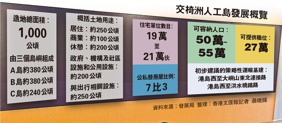 鍾文傑表示,交椅洲人工島合共可提供最多21萬個單位,容納50萬至55萬人口,規模約相當於沙田及馬鞍山,「透過新建的道路或海底鐵路,十多分鐘便可直達中環。」