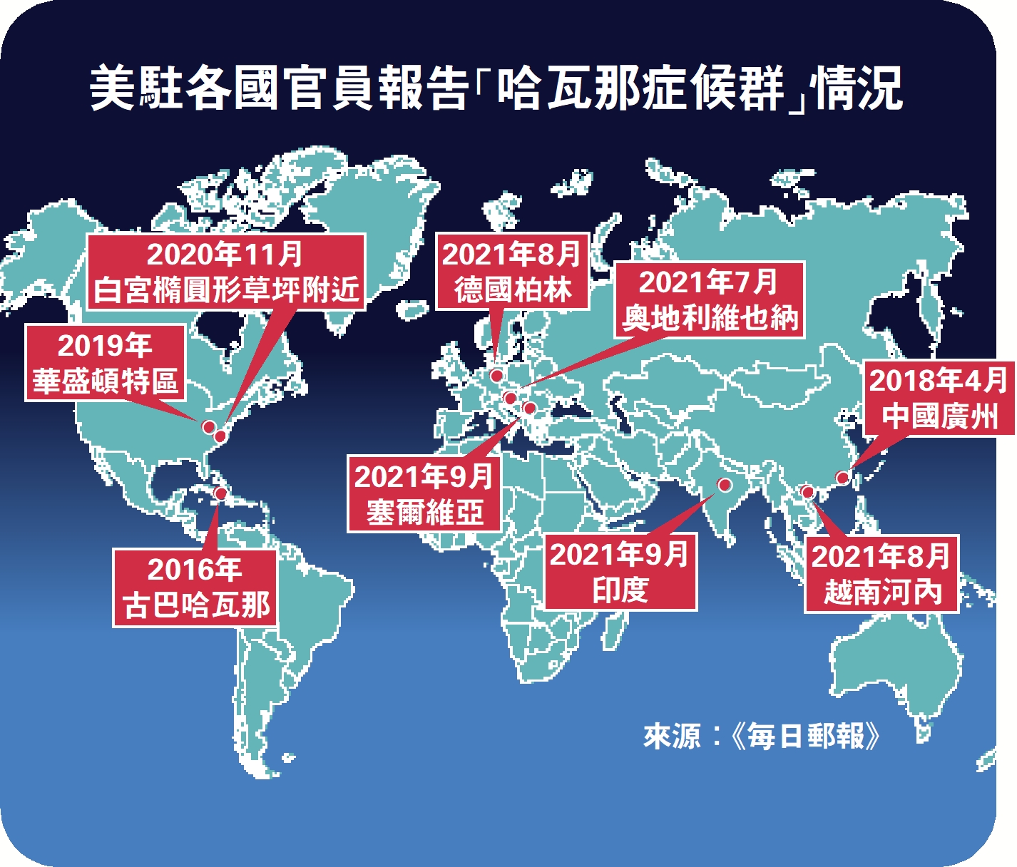 「哈瓦那症候群」最早出現於2016年底,當時美國派往古巴首都哈瓦那的部分外交官報稱出現原因不明病徵,包括頭痛、疲倦、焦慮及記憶喪失等。自此之後,美國駐德國柏林、奧地利維也納等多國外交官和中情局人員,都先後表示出現類似病徵。美國官員3月1日表示,共有1500多名美國政府僱員通報出現各種症狀,遍布全球96個不同國家或地區。