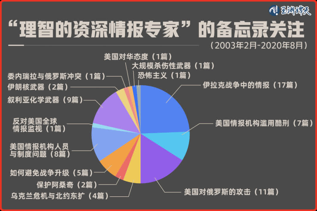 譚主對這70篇備忘錄做了分析,發現數量最多的就是揭露伊拉克戰爭中的情報等各類問題的,共有17篇。