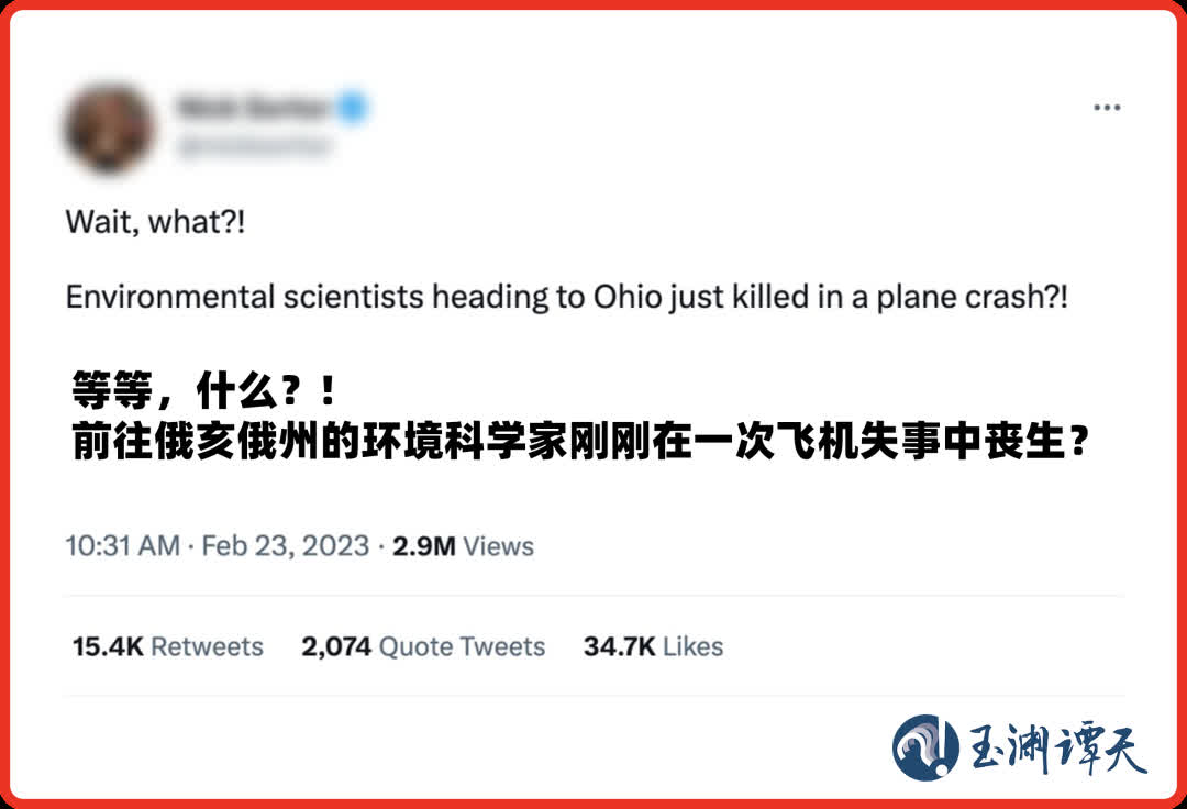 不久前,一架載有5名環境顧問的飛機在前往俄亥俄州的路上墜毀。很快,這件事就在社交媒體上發酵,譚主注意到,熱度最高的一條帖子,用的詞,是環境顧問「被殺」。