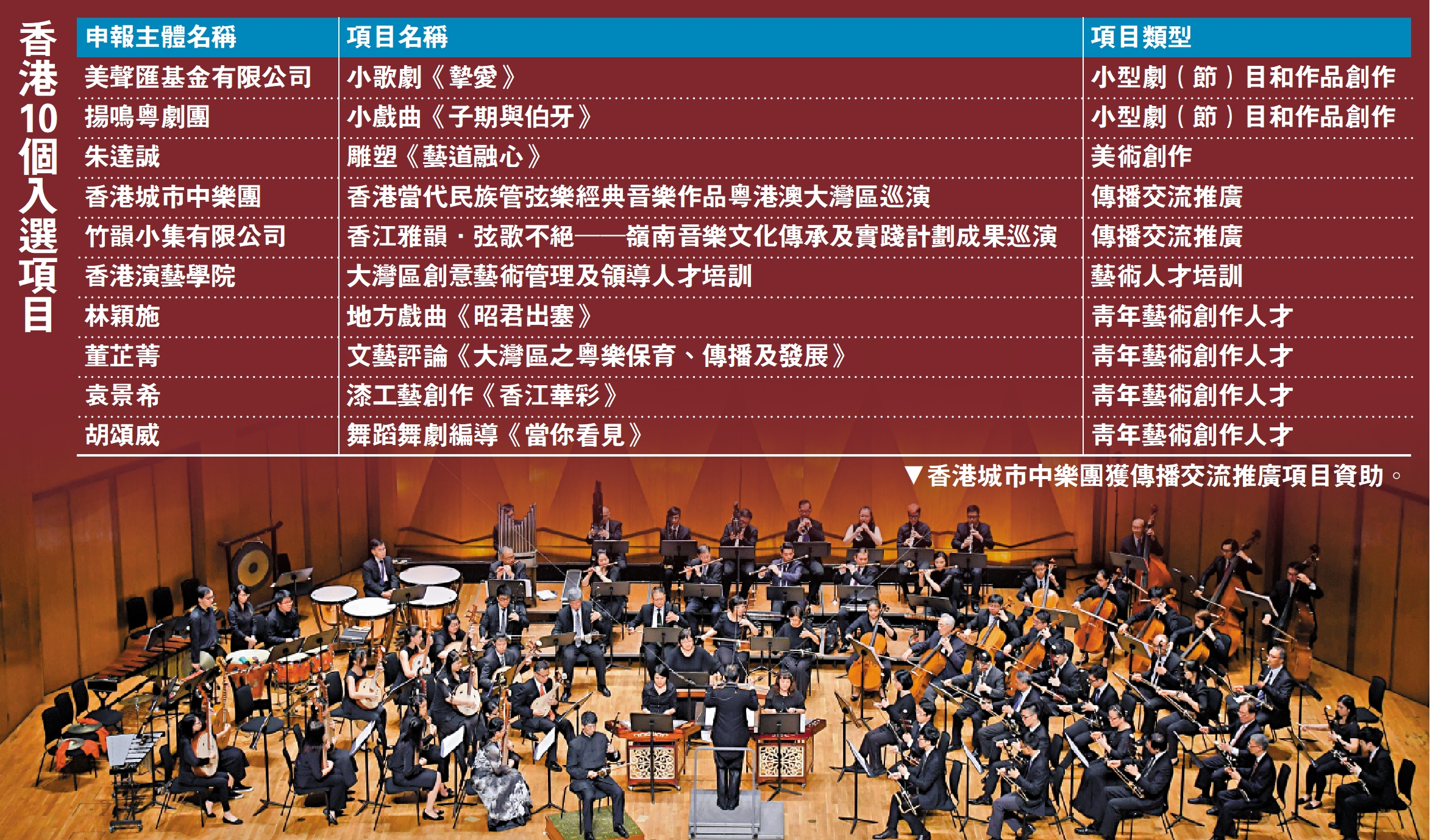 為支持香港發展中外文化藝術交流中心,促進香港藝術文化界和藝術人才發展,國家藝術基金自2021年起,面向港澳特區全面開放一般項目申報,港澳特區藝術機構和藝術工作者可直接申報資助項目。2022年,香港地區9個項目首次入選。