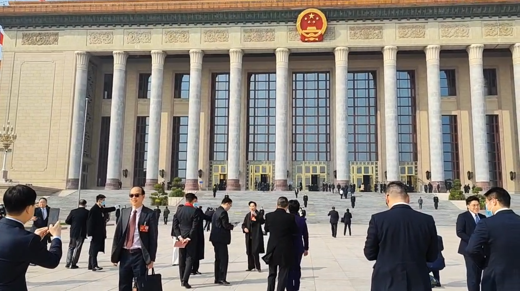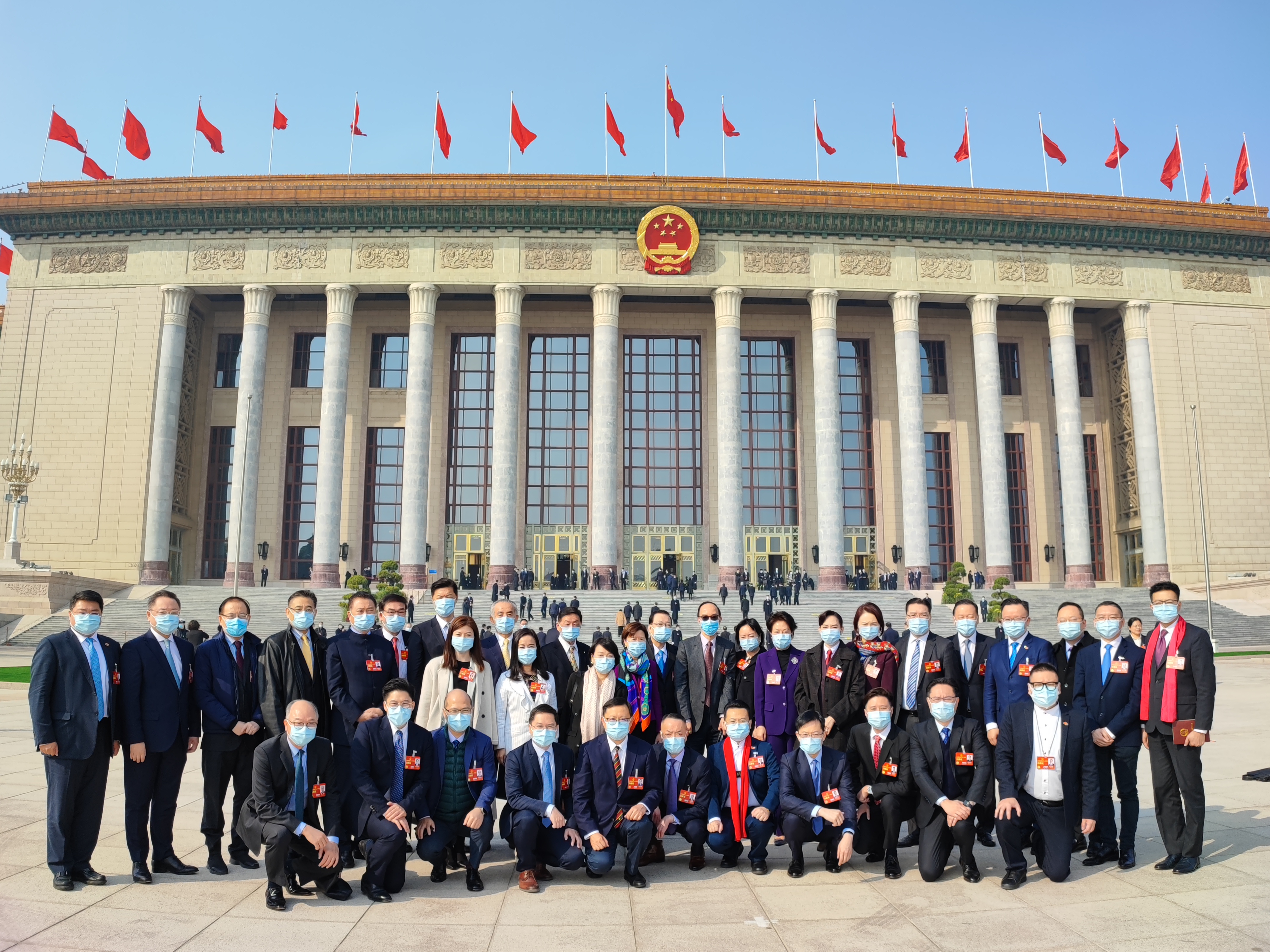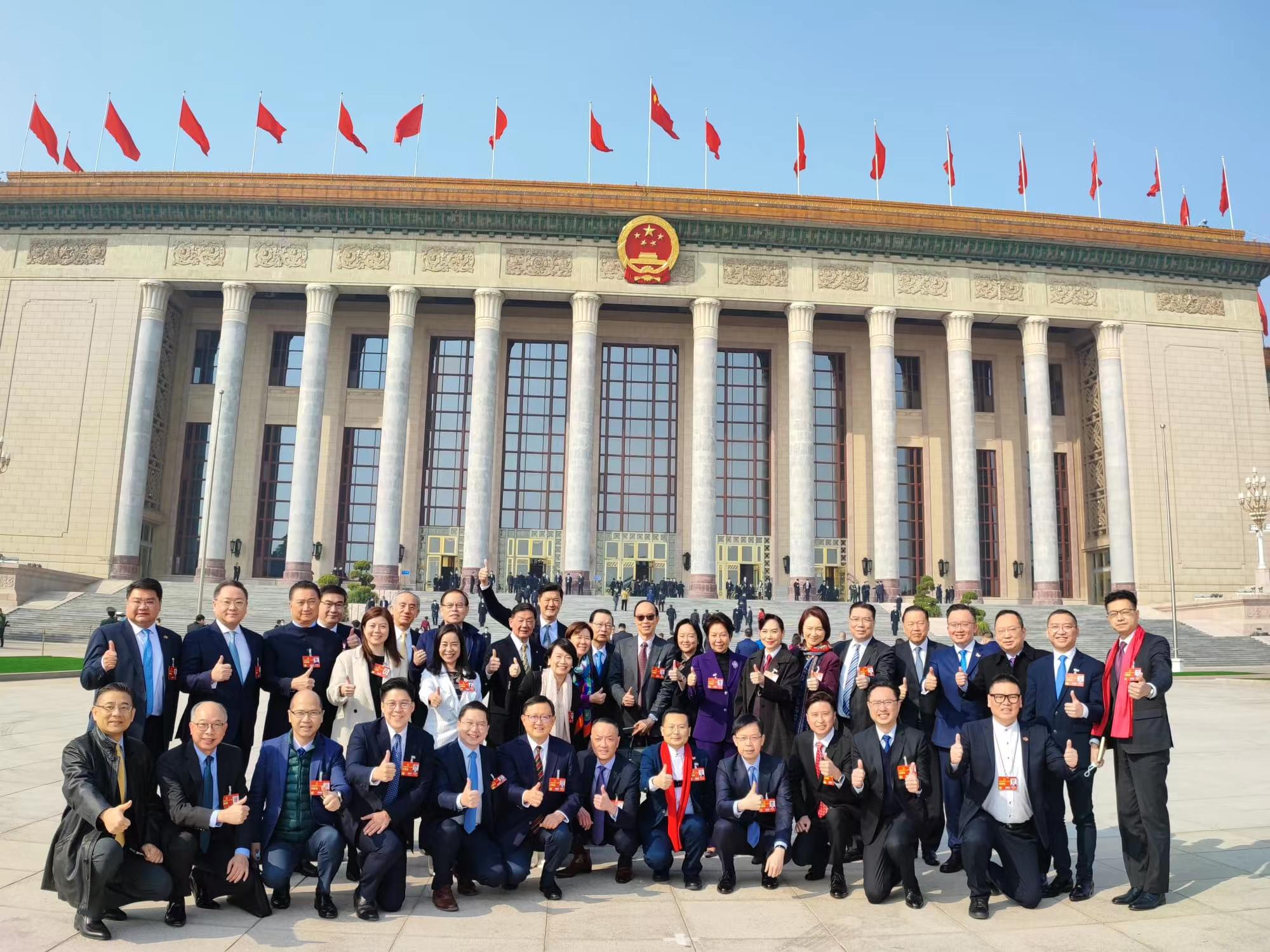 預備會議結束後,一眾十四屆港區全國人大代表與十三屆全國人大常委會委員譚耀宗,在大會堂外合影留念。代表們更互相幫手輪流拍照,忙得不亦樂乎,足見參與兩會的興奮之情。