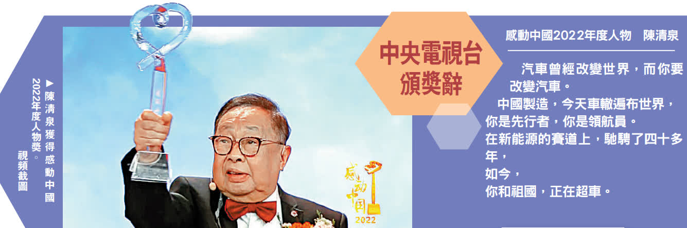 (大公報 記者 湯嘉平)感動中國2022年度人物昨晚(4日)揭曉。中國工程院院士、第十屆全國政協委員、中國能源學會副會長、香港大學教授陳清泉院士榮獲「感動中國2022年度人物」獎。陳清泉是第一位中國工程院香港院士,他始終心懷祖國、心繫香港,為香港創新科技發展貢獻力量。