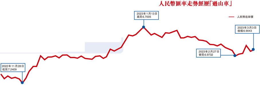 香港文匯報報道,國務院總理李克強昨日在政府工作報告中指出,五年來創新宏觀調控,堅持實施穩健的貨幣政策,人民幣匯率在合理均衡水平上彈性增強、保持基本穩定。今年發展要堅持穩字當頭、穩中求進,保持人民幣匯率在合理均衡水平上的基本穩定。2023年前兩個月人民幣匯率經歷「過山車」:1月氣勢如虹,月度升值2.88%創五年來最大單月升幅,但2月以後掉轉方向再度下行。不過專家普遍預期,受益於中國經濟復甦,今年人民幣大概率升值;但同時,作為全球主要經濟體中唯一仍在進行貨幣寬鬆的經濟體,人民幣同樣面臨貶值壓力。後疫情時代人民幣匯率波動大增,應對匯率波動、防範跨境資金風險,是當前宏觀政策的重大挑戰。