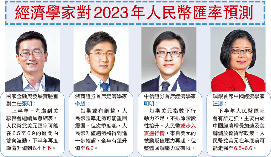 2月初,多家國際投行調升年內人民幣匯率預測。滙豐銀行將2023年底人民幣兌美元預測從6.9調整至6.5,但報告也強調人民幣並非處於單向升值路徑。「貨物和服務進口的同步增長可能會令市場參與者在今年晚些時候重新評估中國的國際收支狀況。」渣打銀行預測三季度末及年底人民幣兌美元將分別在6.8和6.75。