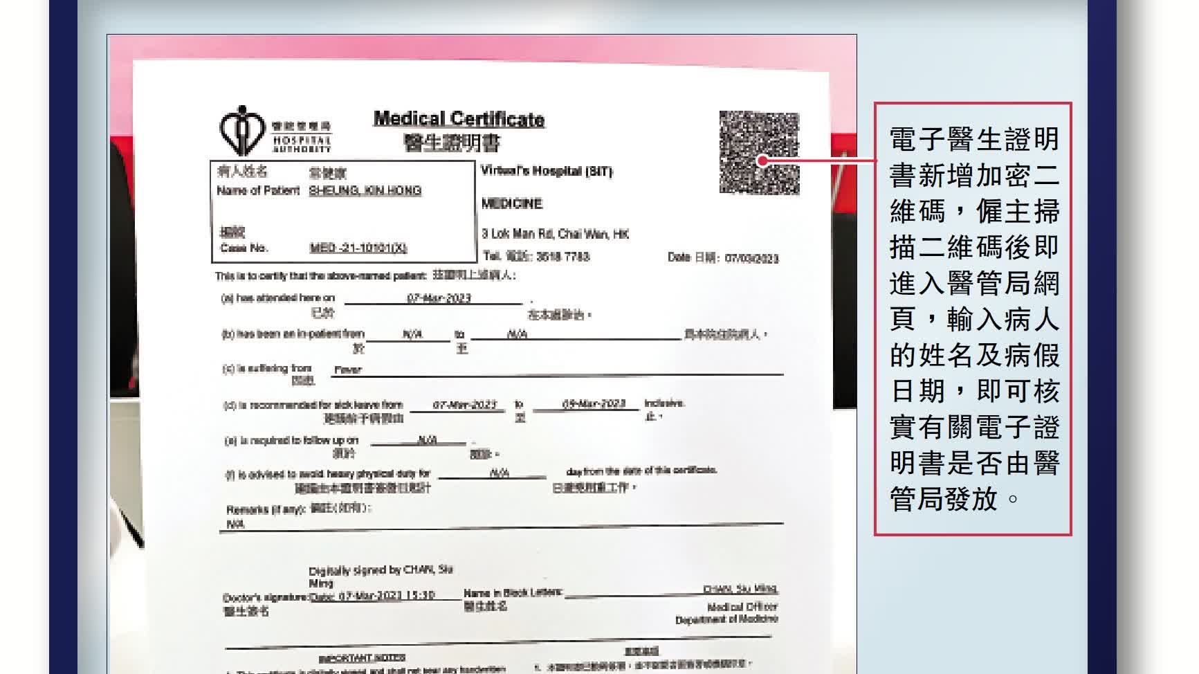 電子醫生證明書會採用電子簽署,醫生無須再手寫簽署,電子簽署與傳統的簽名具有同等的法律效力。電子簽署的醫生證明書與傳統的手簽紙本證明書一樣,都會列明病人姓名及有關的診症資料。每張電子醫生證明書都印有經加密的二維碼,可透過掃描二維碼及輸入病人的姓名及病假日期,核實有關電子證明書。