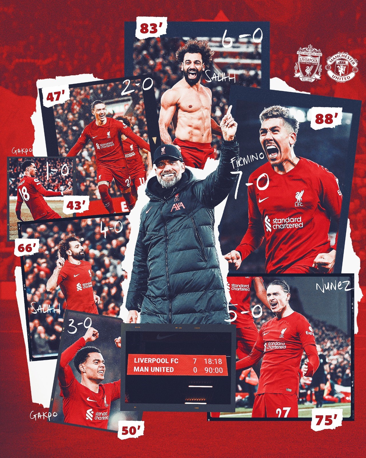 隨後,曼聯追分無望,全線崩潰,利物浦乘勝追擊,75分鐘,紐尼斯禁區內接軒達臣傳中再度頭槌破門,成功上演梅開二度;83分鐘,替補出場的費明奴在小禁區線上背身磕球受阻,皮球誤打誤撞來到沙拿身前,沙拿執雞輕鬆破門,梅開二度,此粒入球是沙拿為利物浦打入英超第129球,超越科拿加冕隊史射手王。第88分鐘,費明奴禁區內接沙拿傳波,雖然停球稍大,但依然窄角破門,利物浦7∶0曼聯,創造了自1895年10月(7∶1)以來雙紅會歷史上最大比分紀錄。