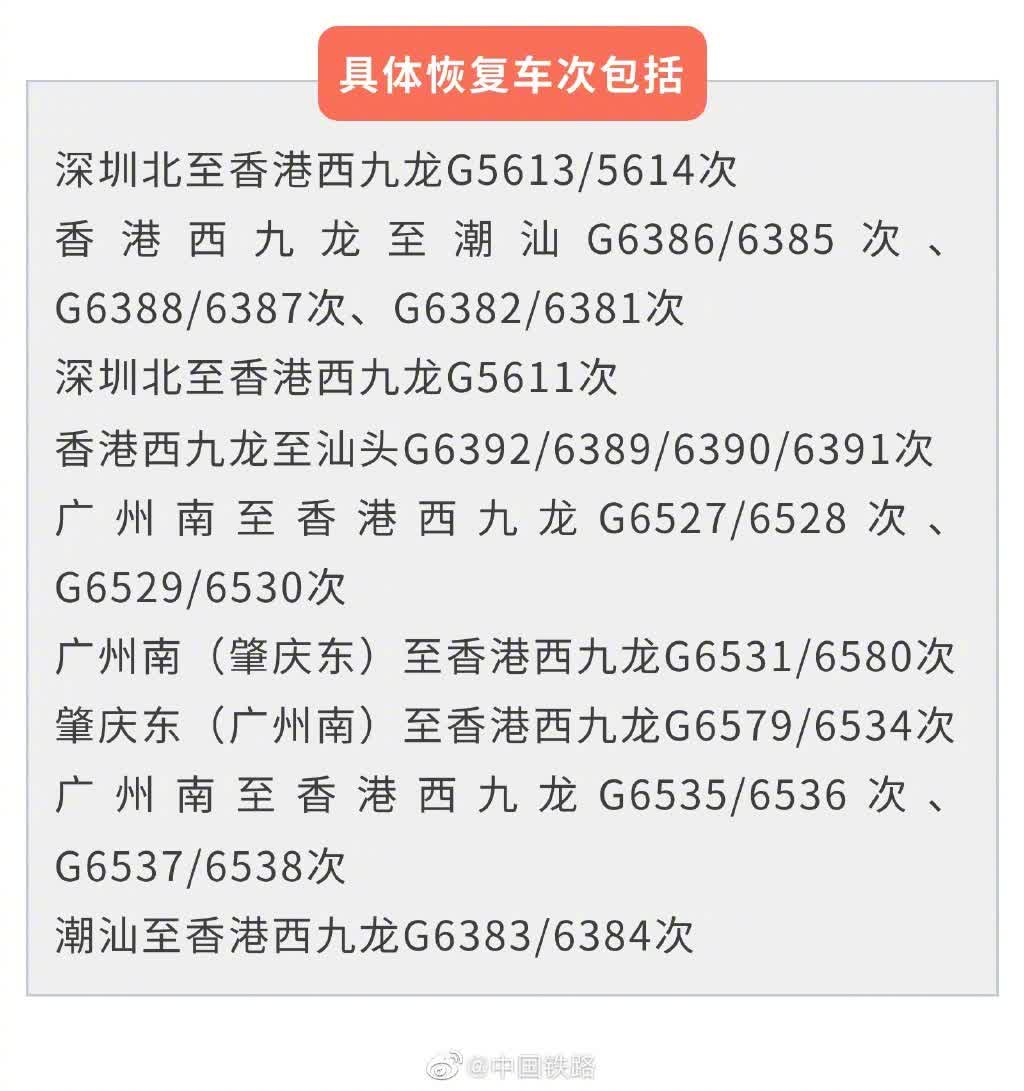 根據近2個月運營和客流分析,鐵路部門適時優化調整運輸方案,逐步恢復開行粵港澳大灣區及粵東地區開往香港熱門方向列車,持續推進跨境高鐵旅客運輸有序恢復。具體恢復車次包括:深圳北~香港西九龍G5613/5614次,香港西九龍~潮汕G6386/6385次、G6388/6387次、G6382/6381次,深圳北~香港西九龍G5611次,香港西九龍~汕頭G6392/6389 6390/6391次,廣州南~香港西九龍G6527/6528次、G6529/6530次、G6535/6536次、G6537/6538次,廣州南(肇慶東)~香港西九龍G6531/6580次,肇慶東(廣州南)~香港西九龍G6579/6534次,潮汕~香港西九龍G6383/6384次。