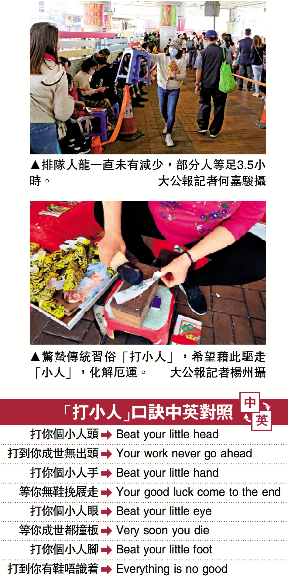 又到傳統習俗「打小人」的日子,有網民為此製作一份「驚蟄打小人口訣中英對照表」,包括將「打你個小人頭」譯為「Beat your little head」、「打到你成世無出頭」譯為「Your work never go ahead」等。打小人的地方一般會在陰暗處、三岔路口、橋底等地進行,而銅鑼灣鵝頸橋恰好面對三岔路口,為最佳三煞位,遂成為「打小人」至佳地點。昨日(6日)為口罩令取消後首個驚蟄,鵝頸橋底早上已人頭湧湧,未至於水洩不通,近百人排隊「打小人」,「噠噠」聲此起彼落。
