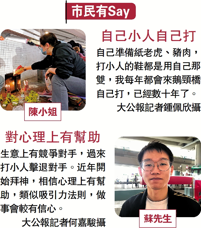 驚蟄除了打小人外,亦有不少人是為自己或家人祈福。梁小姐表示,新年求籤時有解籤師傅說她今年容易有腳傷,建議她驚蟄當日打小人化解災難,「我平時有做開運動,我不想傷到腳。」