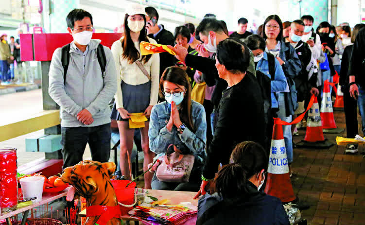 (大公報 記者 鍾佩欣、楊州)昨日是口罩令取消後首個驚蟄,「打小人」熱門地銅鑼灣鵝頸橋底,一大早就人頭湧湧,下午更有近百人排隊等候光顧,求安心、驅霉運。今年「打小人」維持公價50元起,現場約15檔「專業打手」開檔,較平日急增一倍。人潮持續,有擺攤的「神婆」笑說:「多啲嚟密啲手」,連同祈福等配套服務,五、六分鐘就完成一宗生意,保守估計一日至少有逾萬元收入。有檔戶表示,驚蟄前後主要「打小人」及祈福,一般有五、六萬元收入,平日則會多元經營,包括擇日、睇相、睇家宅風水等。
