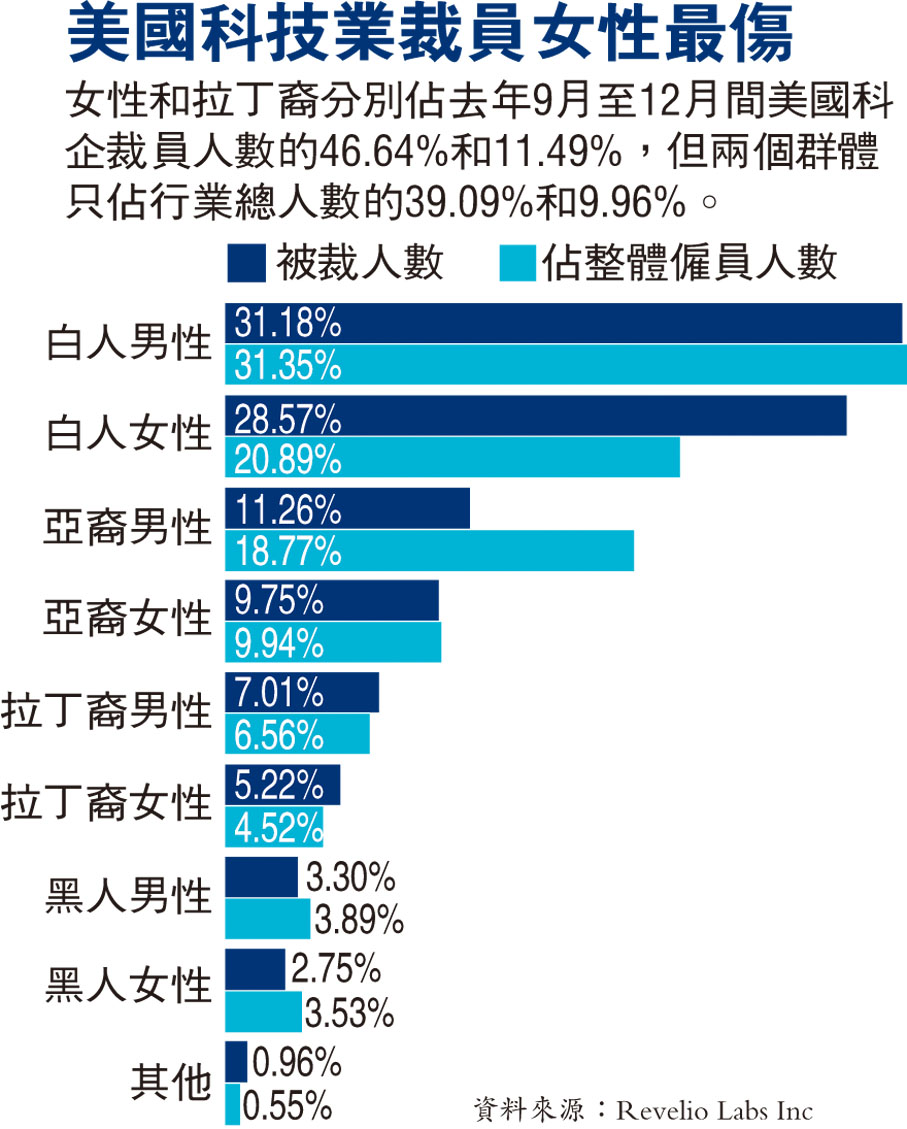 裁員數據追蹤機構Layoffs.FYI的數據顯示,去年9月至12月間美國科技企業裁減的員工中,多達46.64%是女性,比例遠高於女性員工在整個行業的佔比。另一項調查也顯示,美國女性科技從業員在這輪裁員潮中,被裁的機會較男性同行高65%。社交網站Twitter兩名前員工此前便入稟,控告公司在多輪裁員行動中,不合比例地針對女性員工,指多達57%女性員工被裁,遠多於男性的47%。