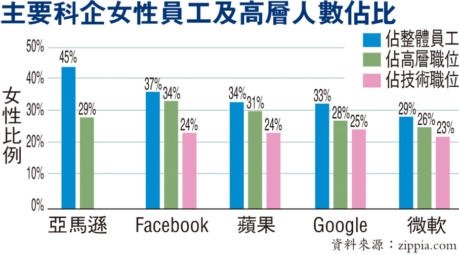 這種做法亦導致了科企內部愈高的職位,女性佔比就愈少的情況。推動女性從事科技業組織AnitaB.org的研究顯示,美國科企實習生和初入行職位中,女性大約佔了38.5%和33.8%,但中層和高層行政人員中就只有28%和23.1%是女性。