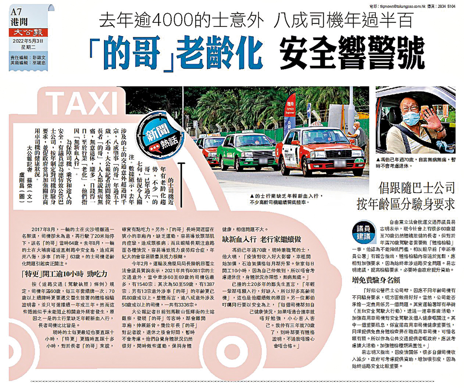 何先生亦憶述他昨日在交通燈前等候轉燈時,看到旁邊另一輛的士內,正在駕駛的司機突然垂下頭打瞌睡,坐在他身旁的內地乘客都表現得很驚訝。現時內地營業車司機設有駕駛歲數上限,但香港則沒有年齡限制。另外,對於有建議將續牌體檢年齡門檻由70歲降至65歲,入行43年的何先生今年正好65歲,他亦表示贊成:「檢查下最好,65歲仍很壯健的。」