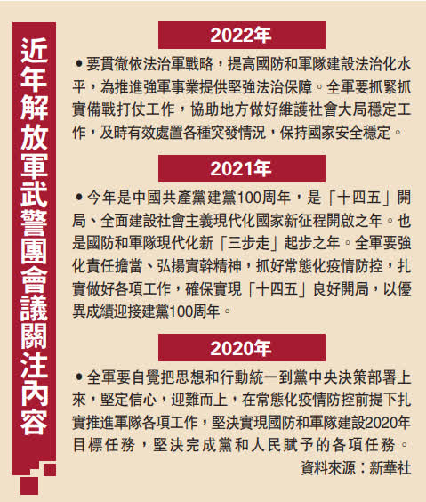 中央軍委委員、軍委聯合參謀部參謀長劉振立說,要加快提高實戰能力,堅定靈活開展軍事鬥爭,堅決塑造安全態勢、遏控危機衝突、打贏局部戰爭;全面加強軍事治理,強化戰建備統籌,深化制度機制創新,確保如期實現建軍一百年奮鬥目標。中央軍委委員、軍委紀律檢查委員會書記張升民說,要聚力服務備戰打仗,縱深推進正風肅紀反腐,為實現建軍一百年奮鬥目標提供堅強紀律和作風保障。
