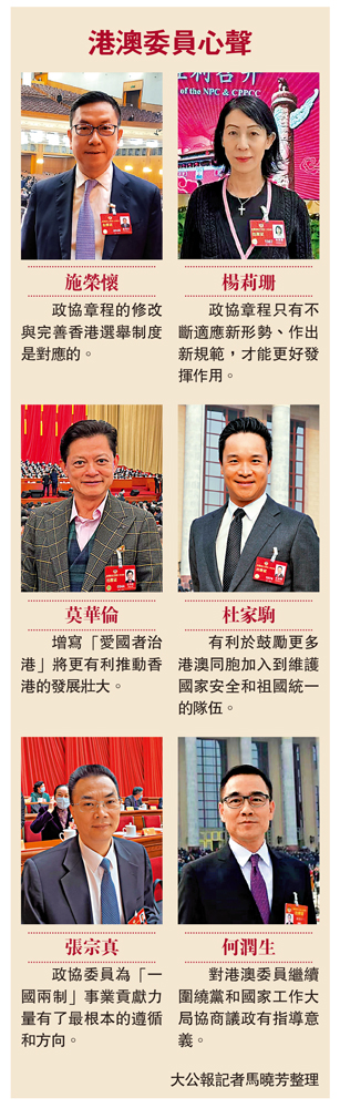 (大公報 記者 馬曉芳、馬靜)對於《中國人民政治協商會議章程修正案(草案)》,在總則中增寫落實「愛國者治港」、「愛國者治澳」原則,多位港澳委員向大公報表示,政協章程修改與完善香港選舉制度對應,有利於落實憲法確立的愛國主義精神,使委員為「一國兩制」事業貢獻力量有了最根本的遵循和方向,從深層次構建了港澳政協委員對國家的認同和情感,有利於保障「一國兩制」實踐行穩致遠。