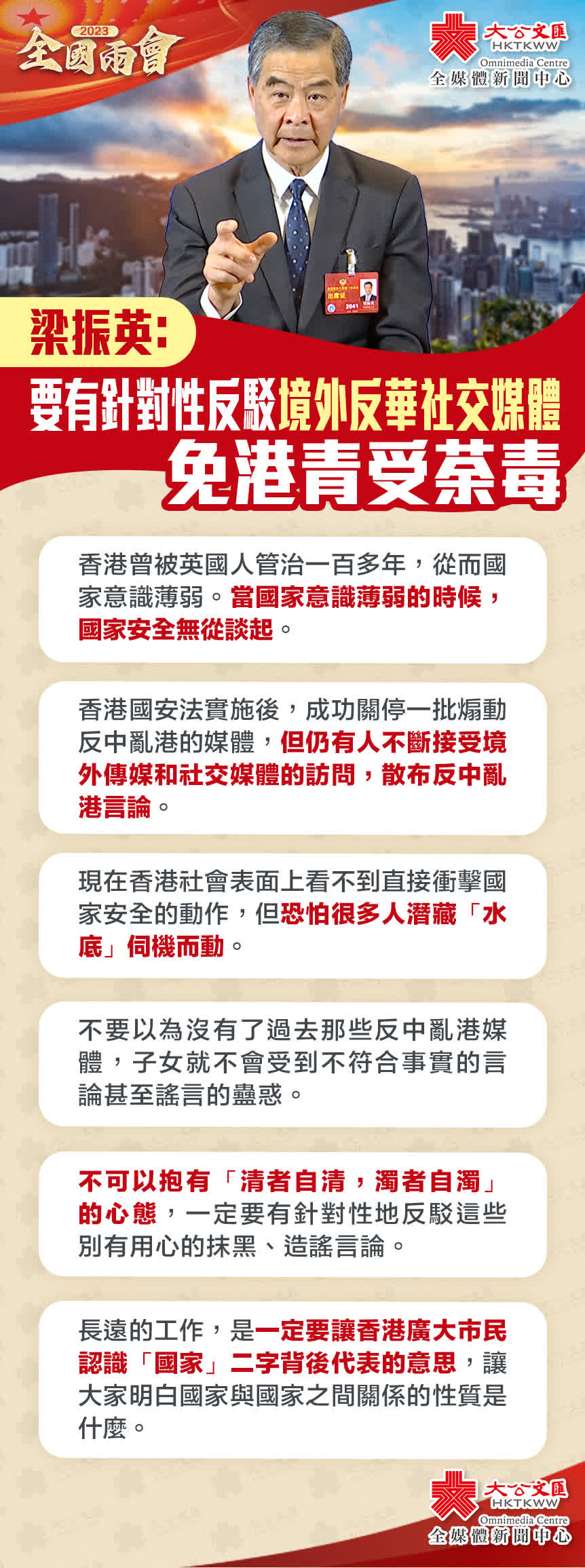 「當國家意識薄弱的時候,國家安全無從談起。」正在北京參加2023年全國兩會的全國政協十四屆一次會議主席團常務主席梁振英今日(9日)接受大公文匯全媒體、點新聞專訪時語重心長地說。在被問及香港在維護國家安全方面還有哪些工作可以做時,梁振英指出,長遠的工作,是一定要讓香港廣大市民認識「國家」二字背後代表的意思,讓大家明白國家與國家之間關係的性質是什麼。梁振英說了哪些金句?快來一圖睇清!