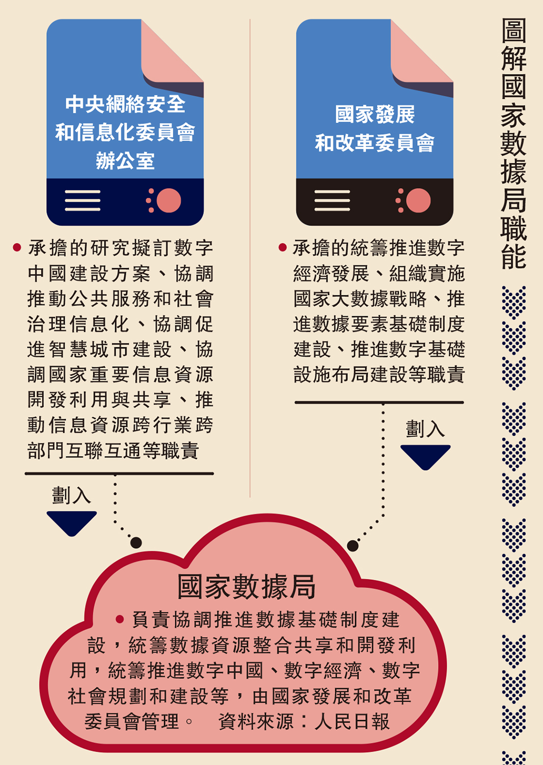 根據提請審議的機構改革方案,國家數據局的職能主要來源於中央網信辦與國家發改委。前者承擔的研究擬訂數字中國建設方案、協調國家重要信息資源開發利用與共享等職責,後者承擔的統籌推進數字經濟發展、組織實施國家大數據戰略等職責,都將劃入國家數據局。