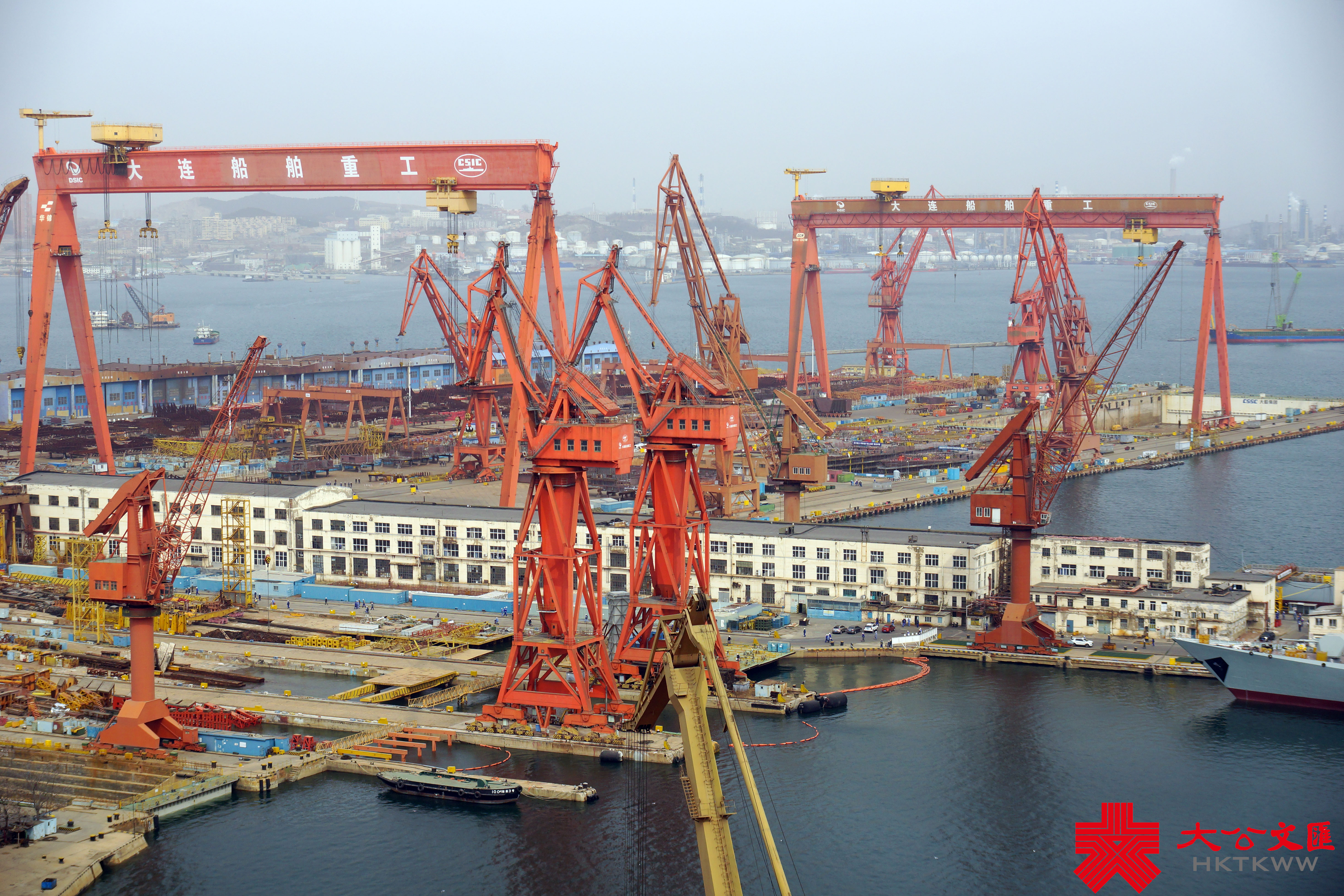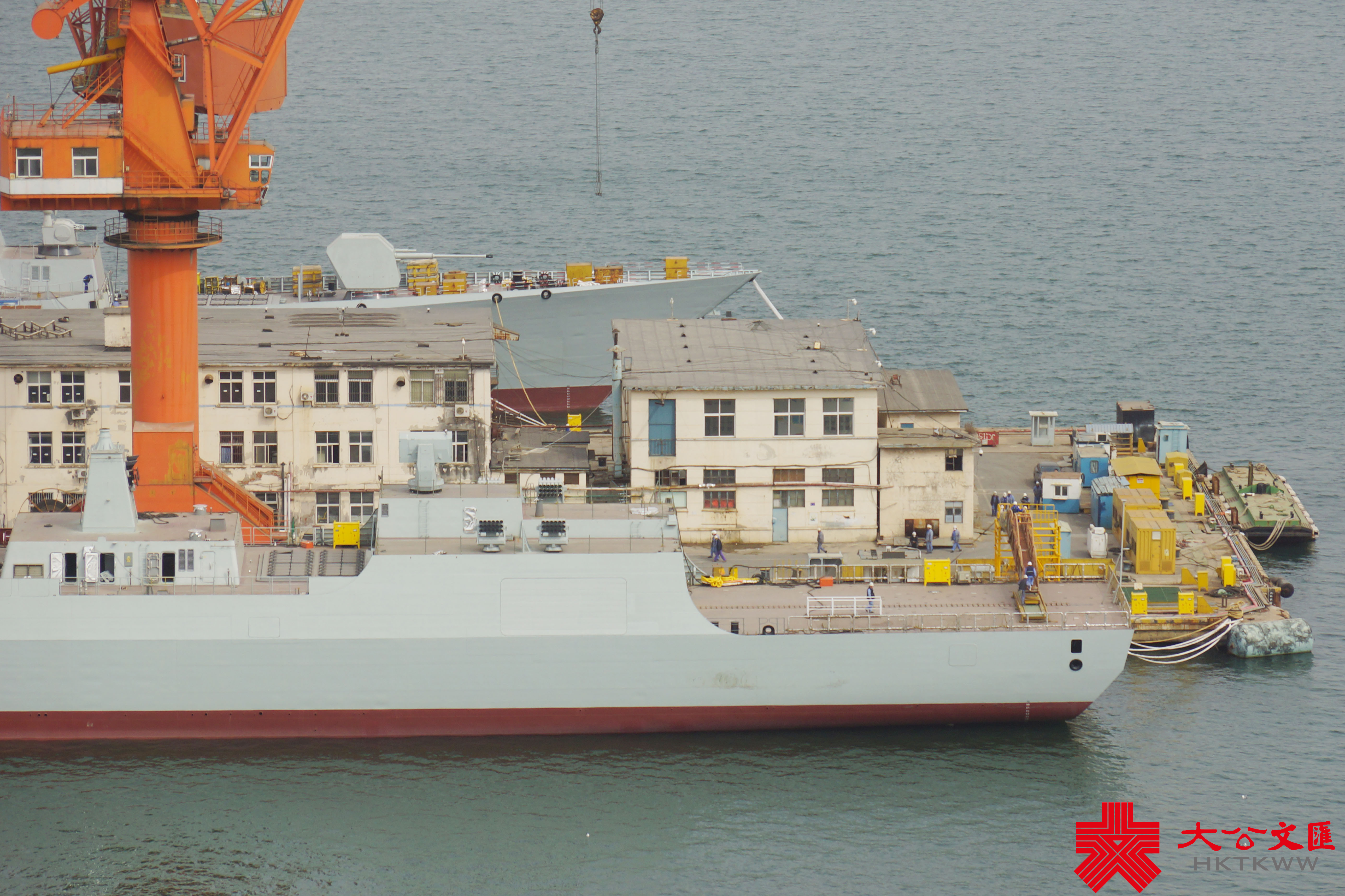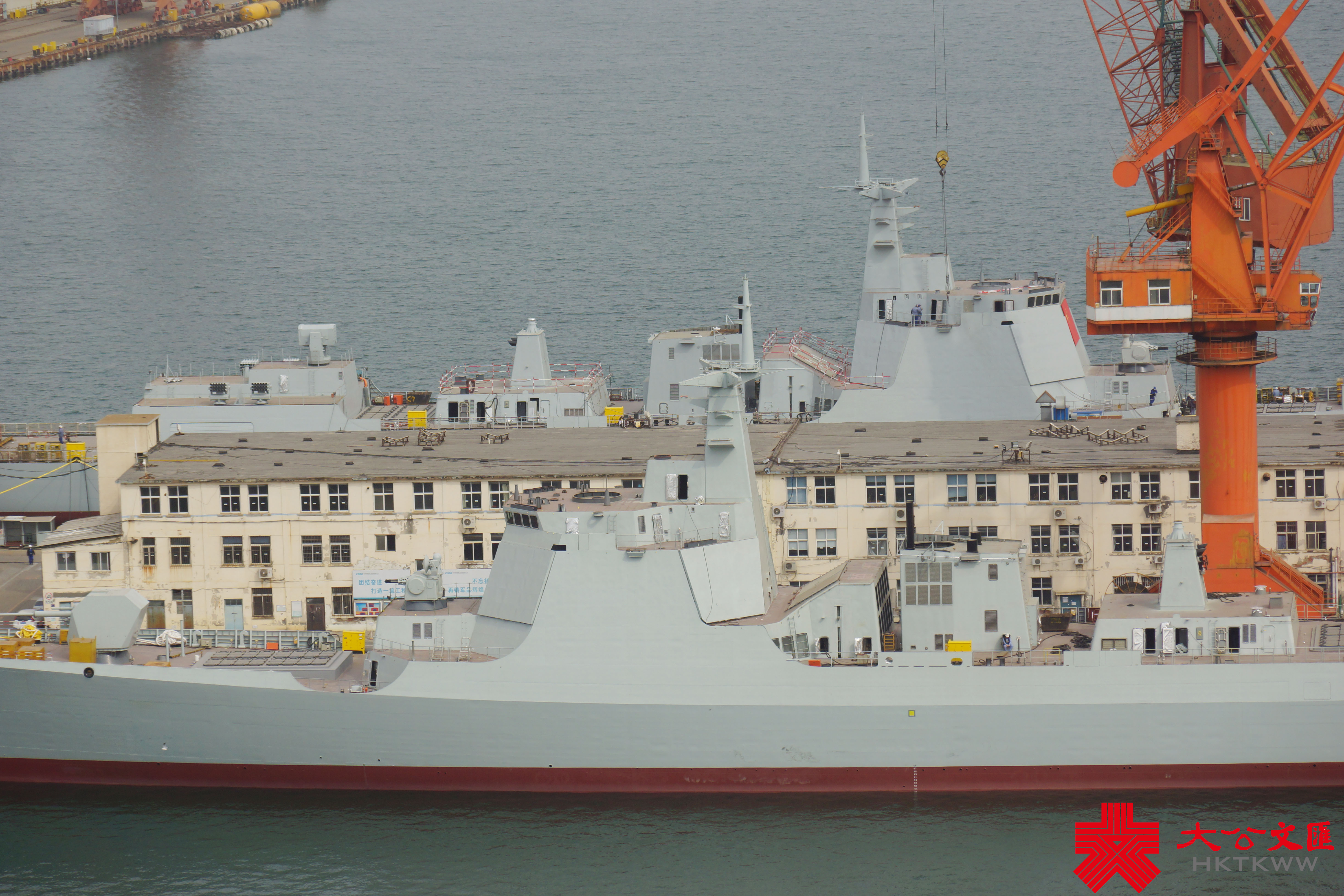 (大公文匯網 記者 宋偉 大連報道)3月10日,由大連造船廠承建的海軍兩艘新版052D導彈驅逐艦在一片濃霧中出塢下水,船塢內尚有三艘同型戰艦正在緊張施工。此次下水的是海軍第27和第28艘052D導彈驅逐艦,該批次依然配備64單元垂發裝置,但艦載雷達料有較大升級。052D船塢以西,日前返廠的遼寧艦頂板雷達已被拆下,正在進行艦體維護施工,尚未進入船塢。