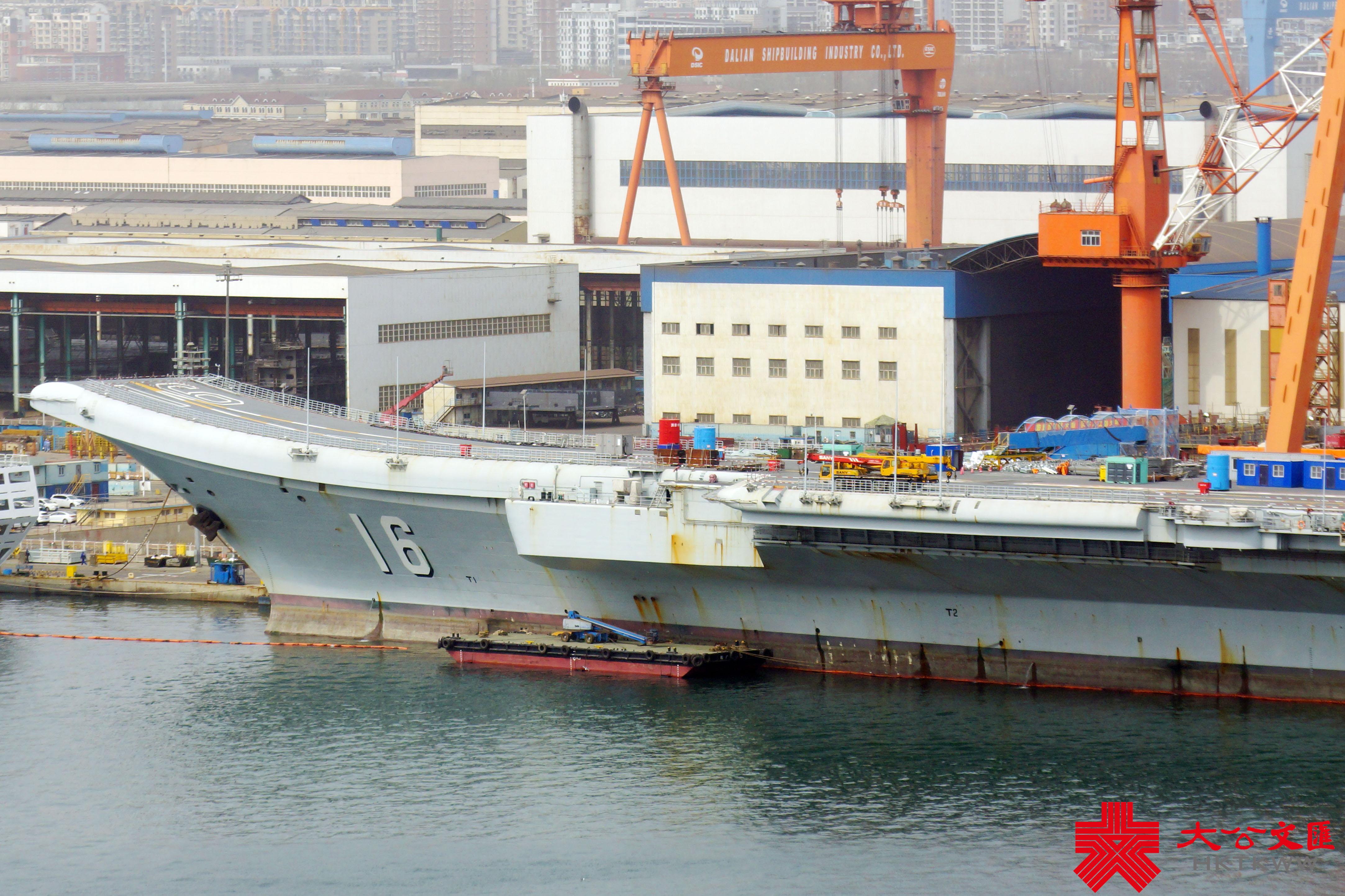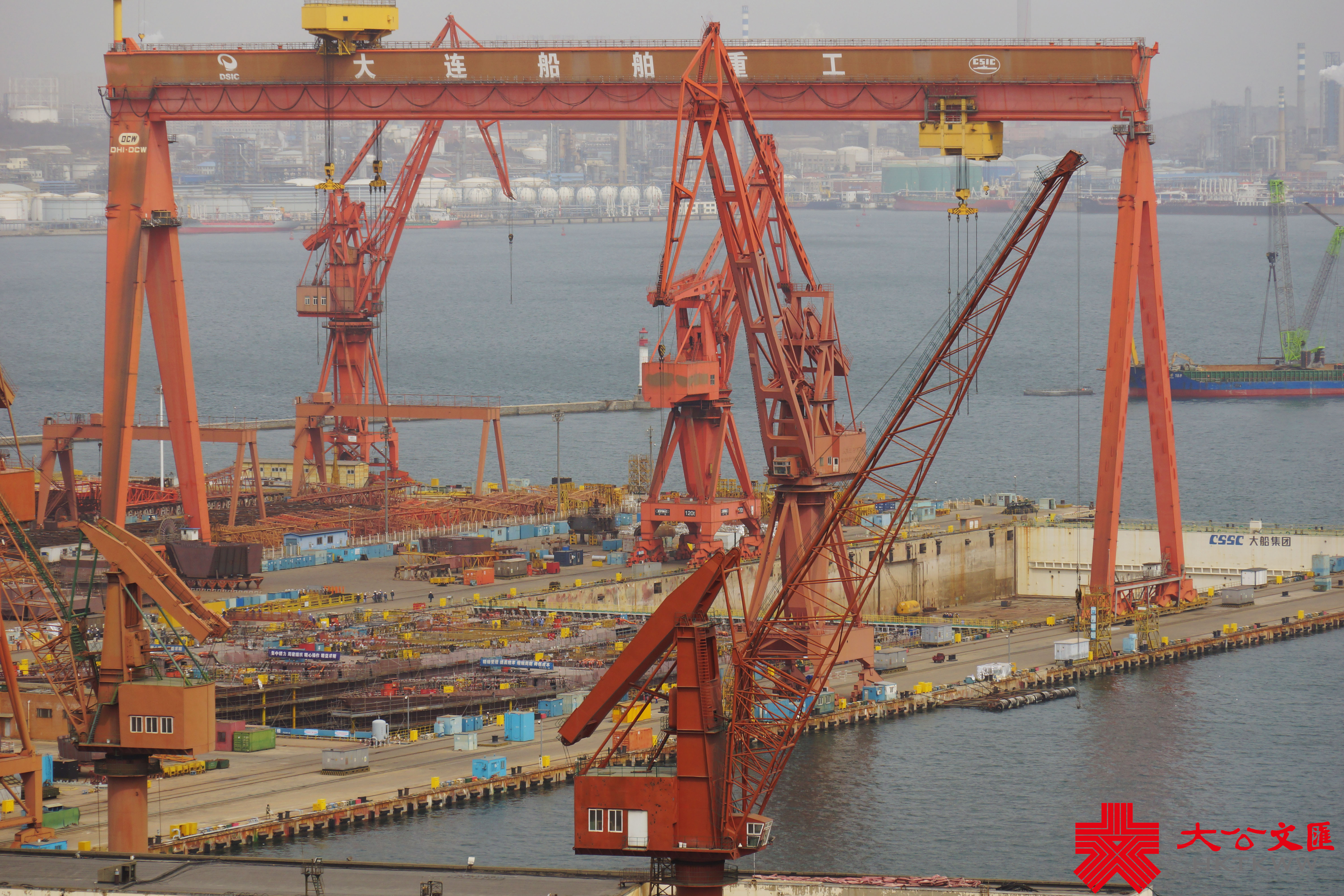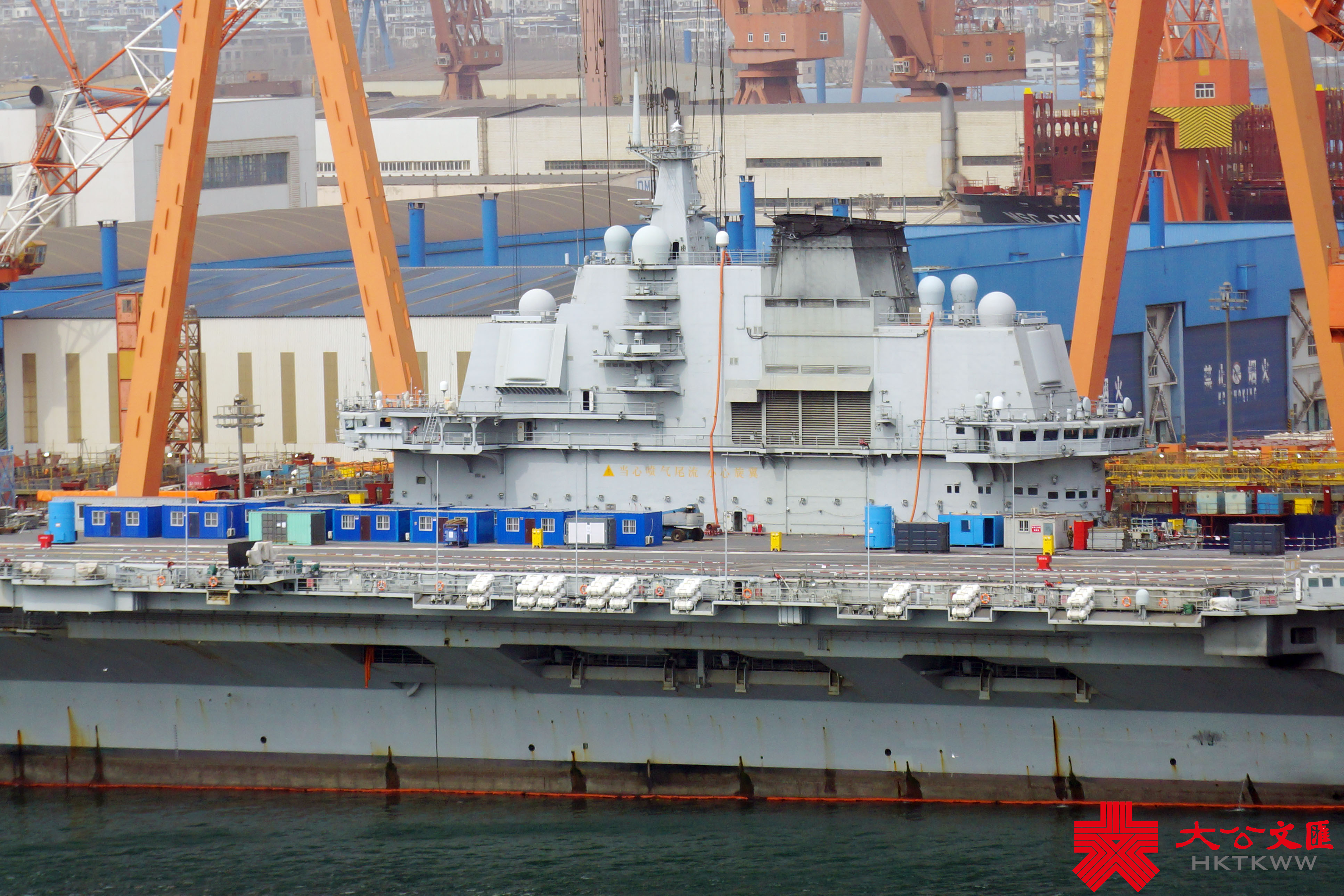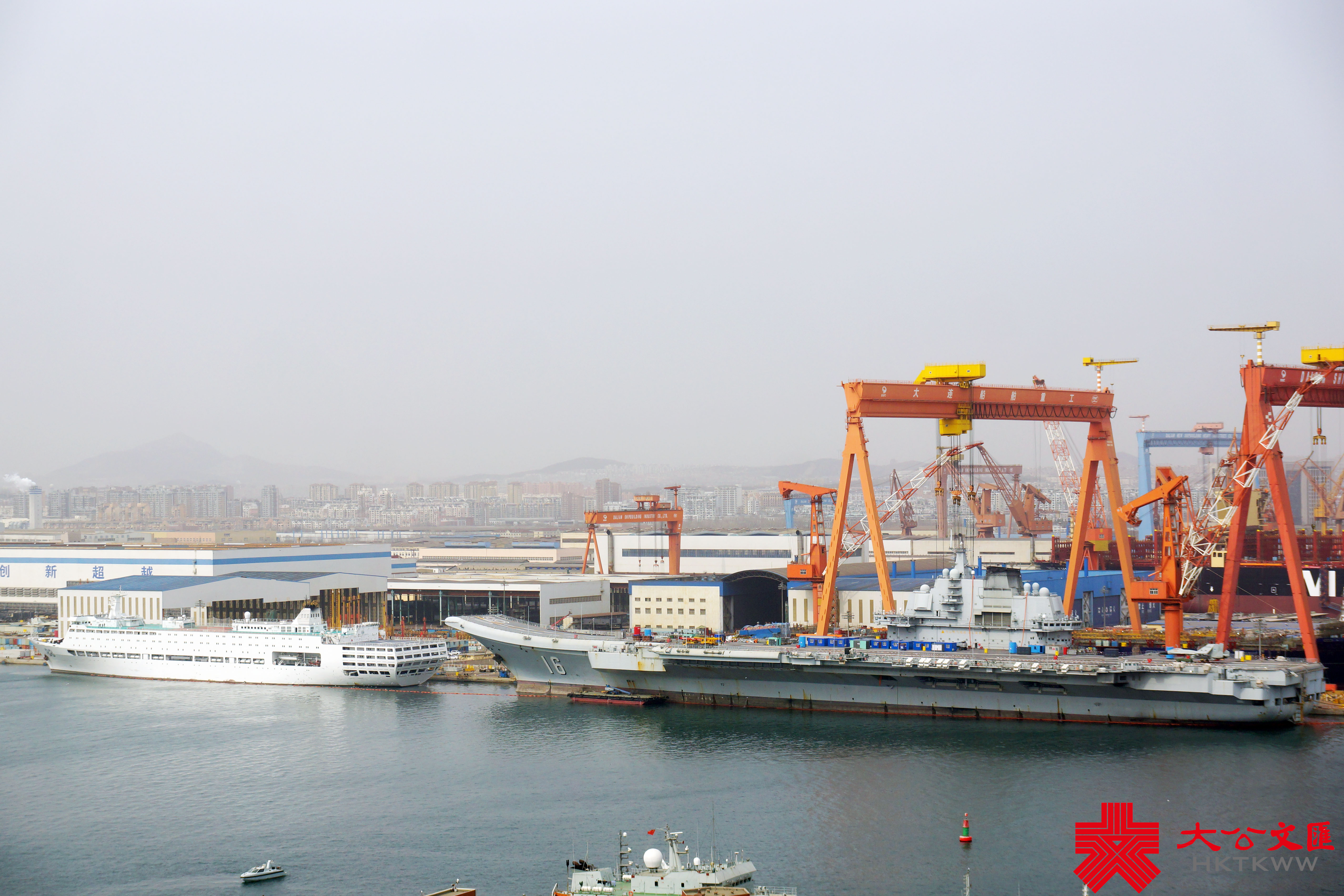 (大公文匯網 記者 宋偉 大連報道)3月10日,由大連造船廠承建的海軍兩艘新版052D導彈驅逐艦在一片濃霧中出塢下水,船塢內尚有三艘同型戰艦正在緊張施工。此次下水的是海軍第27和第28艘052D導彈驅逐艦,該批次依然配備64單元垂發裝置,但艦載雷達料有較大升級。052D船塢以西,日前返廠的遼寧艦頂板雷達已被拆下,正在進行艦體維護施工,尚未進入船塢。