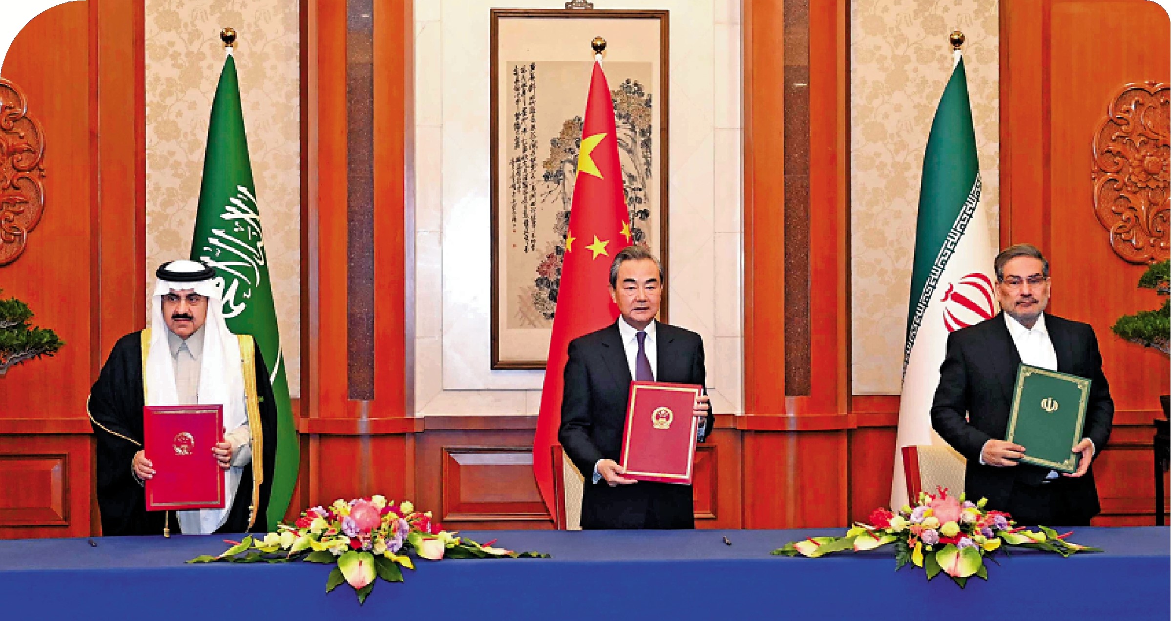 中國、沙特和伊朗10日發表聯合聲明。三國宣布,沙特和伊朗達成一份協議,包括同意恢復雙方外交關係,在至多兩個月內重開雙方使館和代表機構;強調尊重各國主權,不干涉別國內政;雙方同意兩國外長舉行會晤,啟動上述工作,安排互派大使,並探討加強雙邊關係。