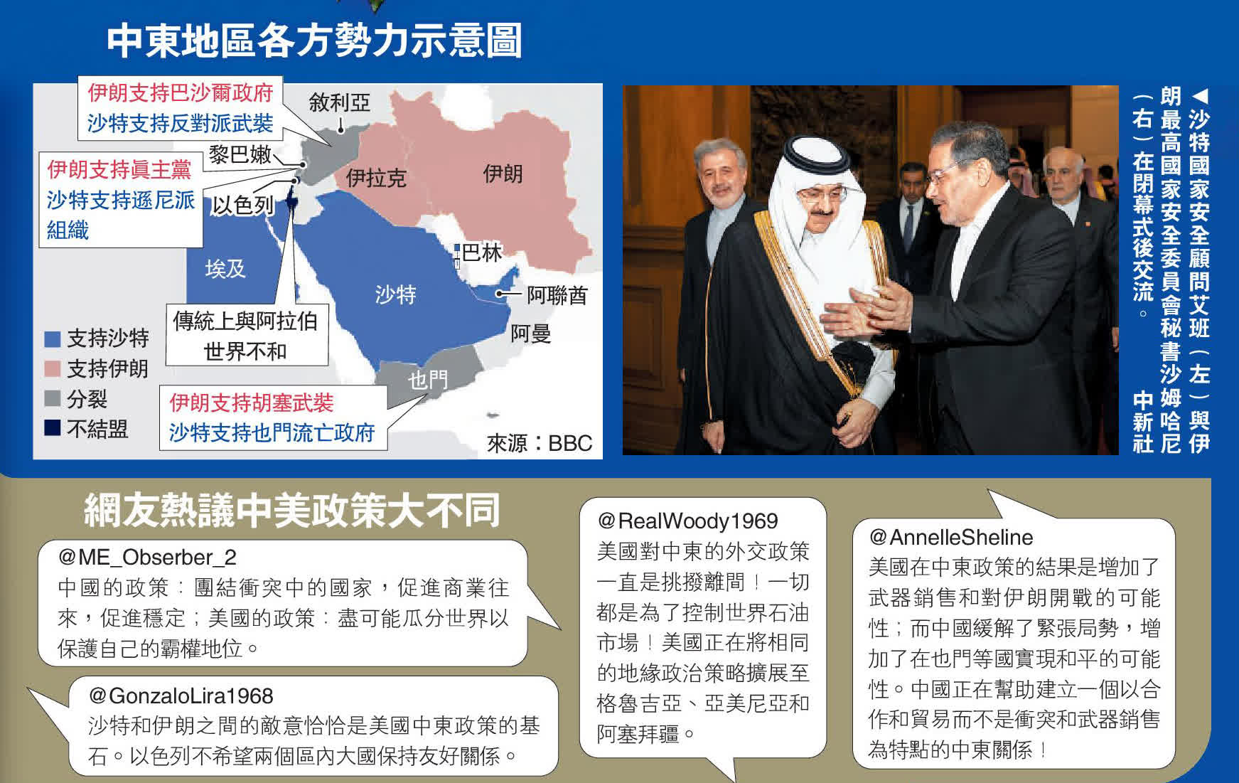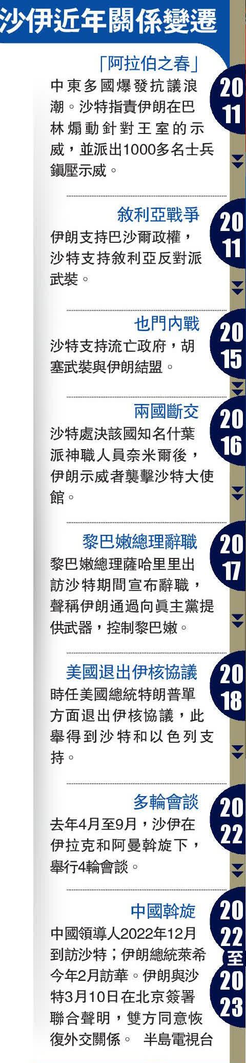 大公報綜合半島電視台、《華爾街日報》、BBC報道:伊朗與沙特10日在中國北京簽署聯合聲明,雙方同意恢復外交關係,並在兩個月內重新互相開放大使館。此消息一發布立即在全球引起巨大關注,多國對該協議表示歡迎,中國作為「善意」「可靠」的斡旋者、調停者角色備受讚譽。多間外媒評論稱,沙伊兩國在中國斡旋下秘密談判並恢復外交關係,是中美在中東地區影響力的分水嶺時刻,表明中國與美國在該地區的影響力一升一降。