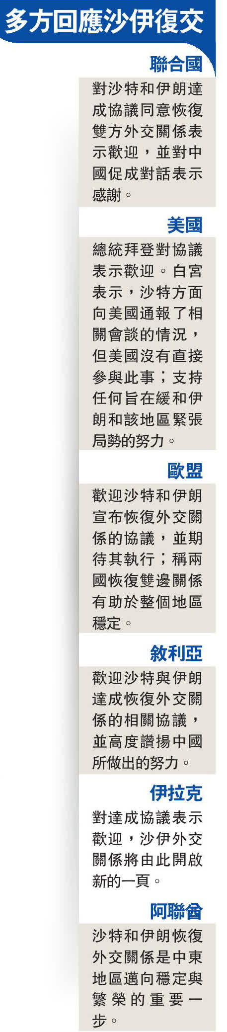 聯合國秘書長古特雷斯10日通過發言人發表聲明,沙特和伊朗之間的睦鄰友好關係對海灣地區的穩定至關重要,感謝中國促成兩國之間的對話。歐盟表示,由於沙特和伊朗都是中東地區安全的核心,恢復雙邊關係有助於整個地區的穩定。