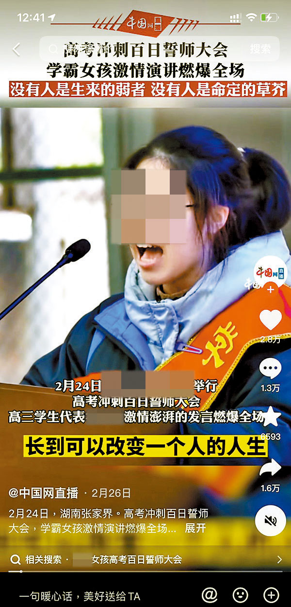 一場激情洋溢的演講將一位高三女生拉入網暴漩渦之中。「凌晨6點的校園真的很黑,但六百多分的成績真的很耀眼。」作為學生代表,她在湖南某中學高考衝刺誓師大會上說出這樣一番宣言。這段演講視頻很快在互聯網傳播發酵,隨即生出波瀾。此後數日,「誓師女孩」遭遇網暴,「你咬牙切齒的樣子真難看」這樣無端的謾罵洶湧而來,將女孩的勤奮上進扭曲為無腦的學習機器,渾然不顧她的身份和壓力——100天後,她即將參加高考,衝刺期盼已久的目標學校。