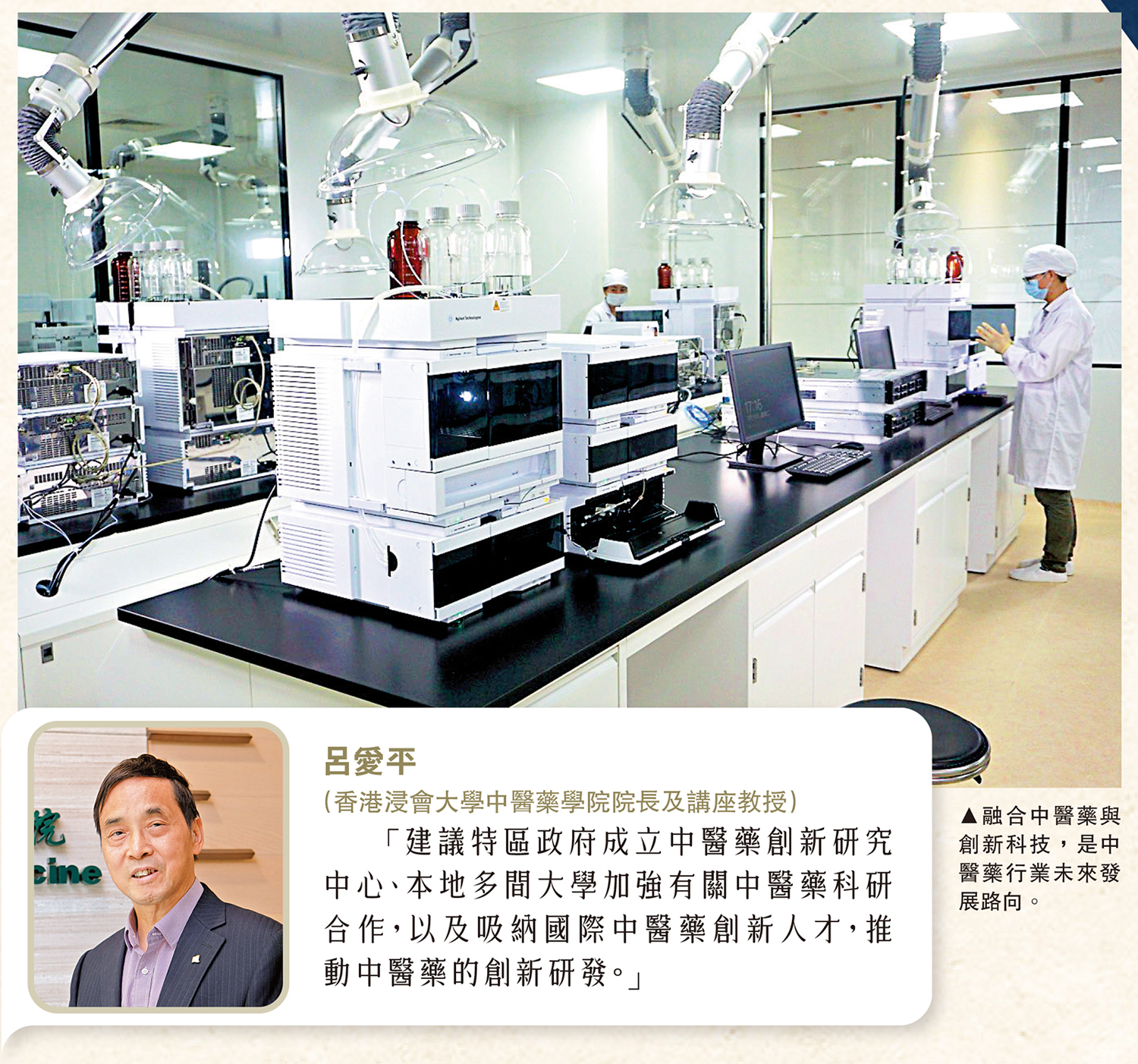 香港浸會大學中醫藥學院院長及講座教授呂愛平日前接受大公報記者專訪時表示,應加強香港中醫藥創新研究,建議特區政府成立中醫藥創新研究中心、本地多間大學加強有關中醫藥科研合作,以及吸納國際中醫藥創新人才,推動中醫藥的創新研發。呂愛平建議,應讓本地中醫師專注專科,提高自身的臨床觀察能力和研究意識,培育更多本地中醫大師。
