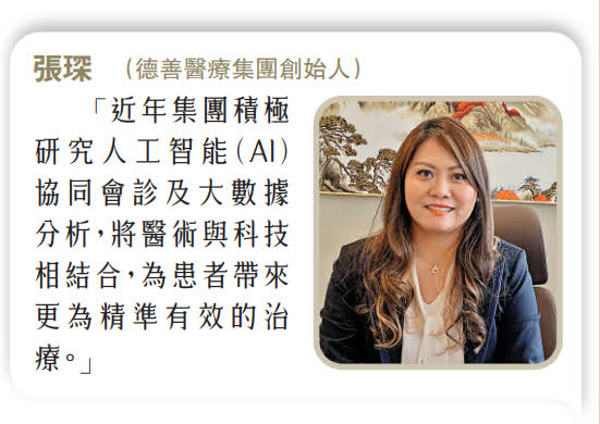 德善醫療集團創始人張琛表示,一直密切關注行業風向,將人工智能(AI)協同會診及大數據分析系統運用至旗下診所的日常臨床服務中;又積極與大學合作,研發新技術革新中藥行業痛點。近年該集團積極研究AI協同會診及大數據分析,將醫術與科技相結合,為患者帶來更為精準有效的治療。從2018年開始,投資於數據庫和系統的研發上已過千萬元,是香港少有運用大數據系統參與臨床診療的中醫醫療機構。